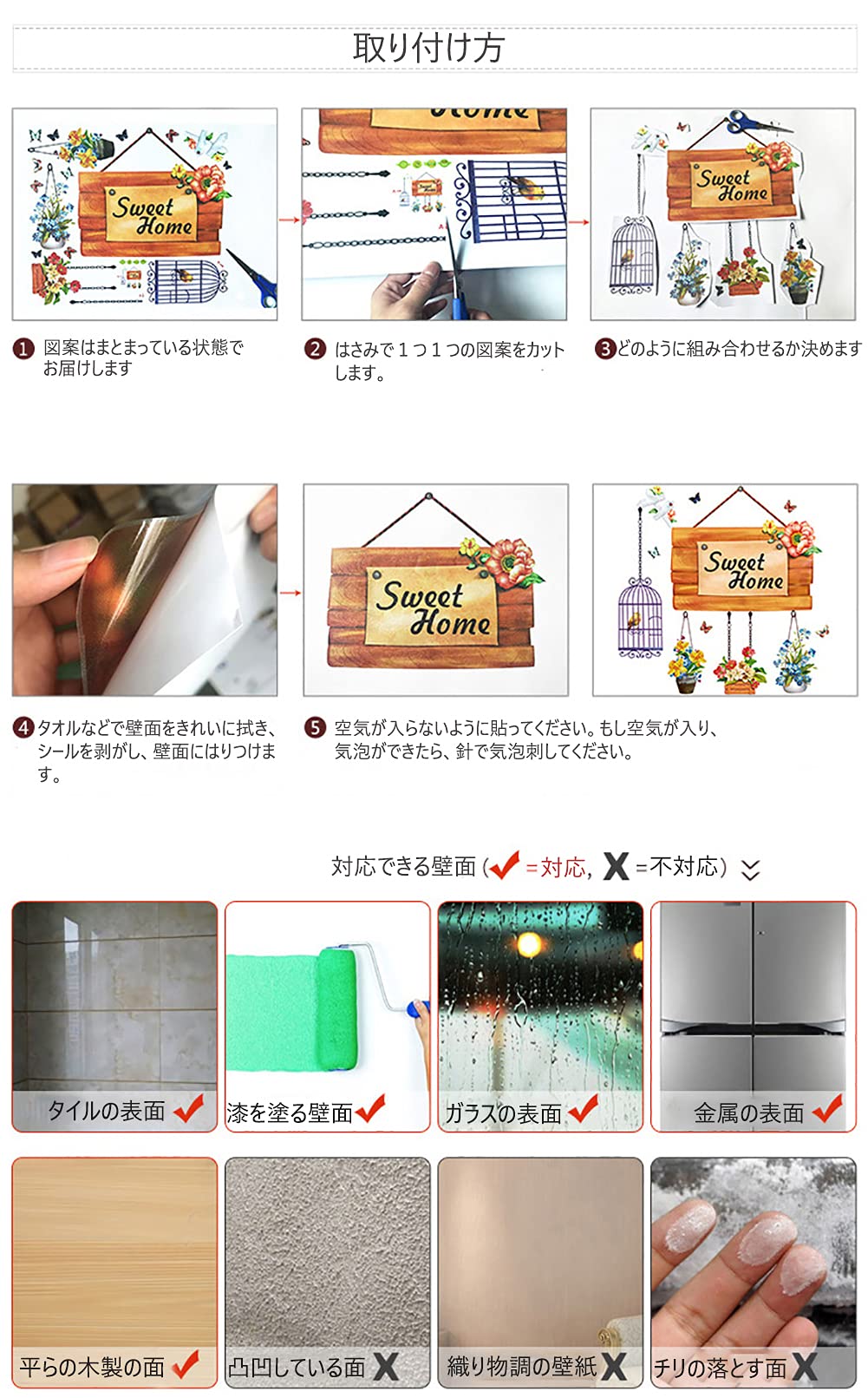 ご注意:このウォールステッカーは漆を塗る壁面やガラス、タイル、金属、木などを素材としてツルツルで平らな表面に貼りつけることができます。織り物調の壁紙、凸凹してる壁面、塵を落としやすい表面に適用していません。