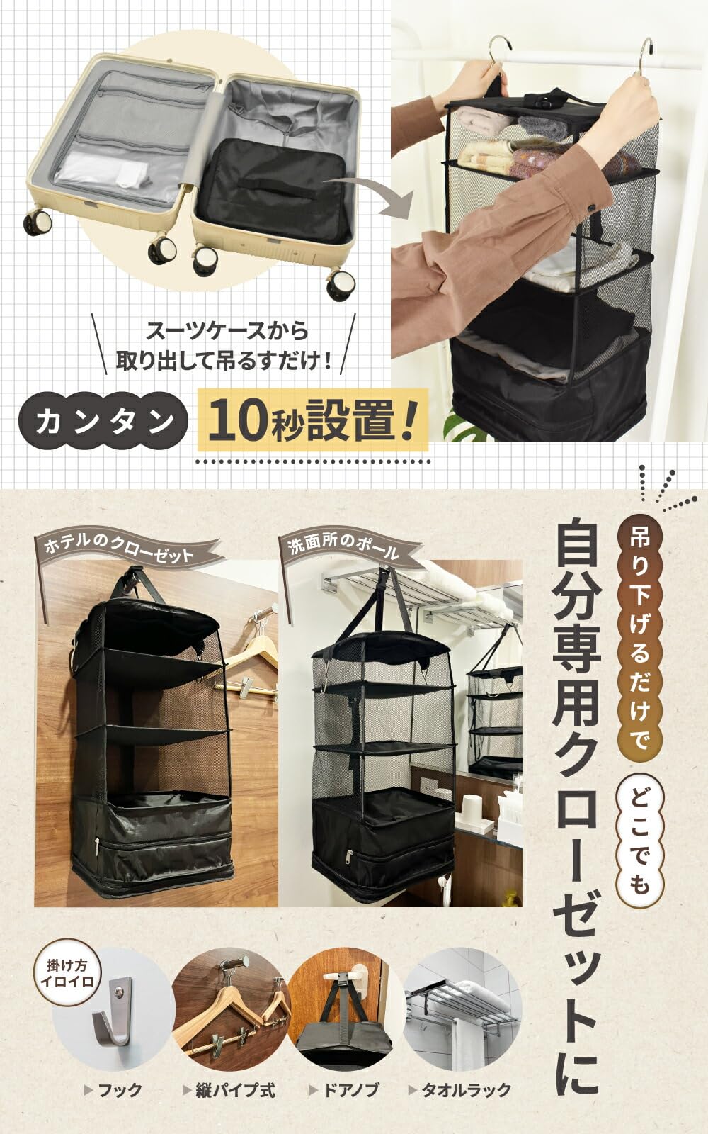 【大容量&取り出しやすい設計】 3つのオープン収納と1つのファスナー収納を備えたLIXIAトラベルポーチは、Lサイズで1〜2泊分、XLサイズで2~3泊分の衣類をきれいに収容可能です。特に1段目には小物用のメッシュポケットがあり、洗面所のポールやホテルの収納スペースに設置しておけば、毎日のコーディネートが簡単に行えます。出発前の朝も、すぐに必要な服を取り出せるため、手間を減らして快適な旅行をサポートします。