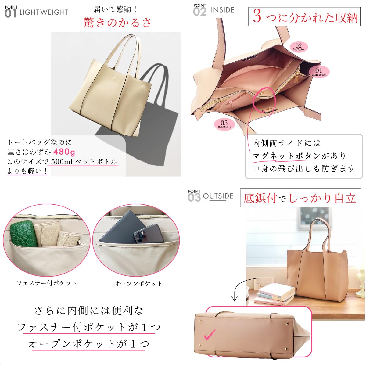 重さ:480g ポケット数:内側×2(オープン×1ファスナー付×1) 外側×0