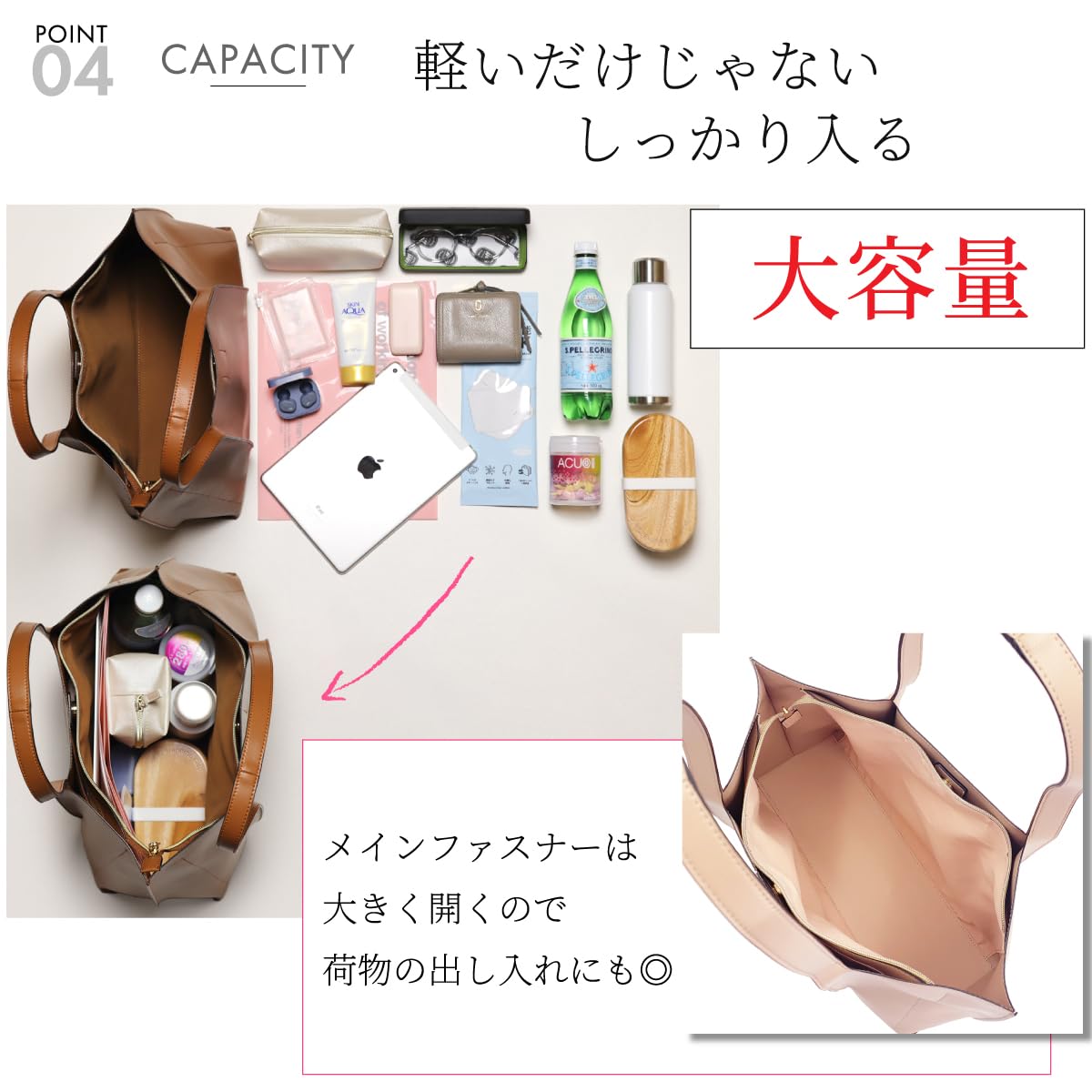 [ANDSHIN] [ アンドシン ] トートバッグ 軽量 A4 大容量 レディース バッグ ファスナー 通勤バッグ A0001