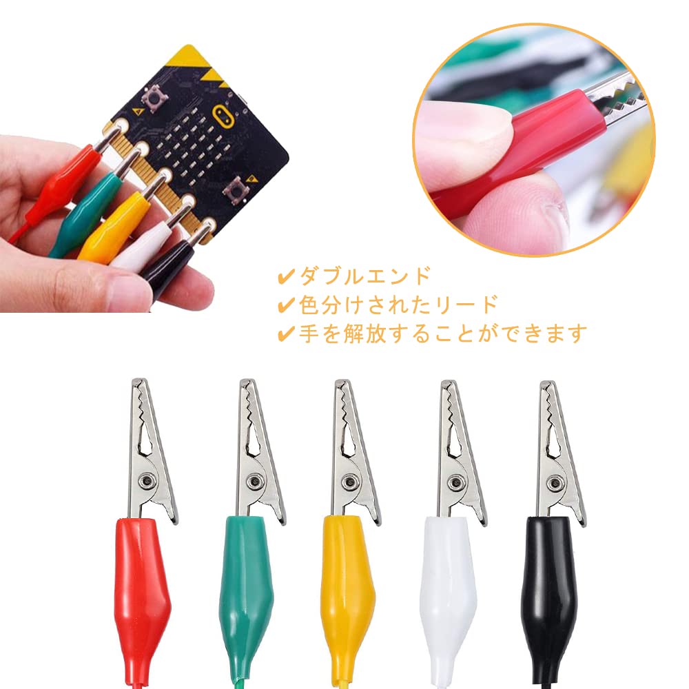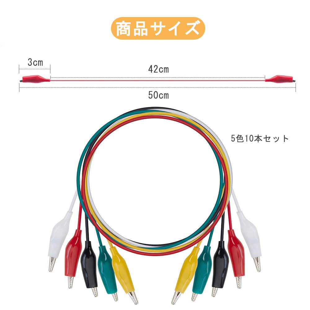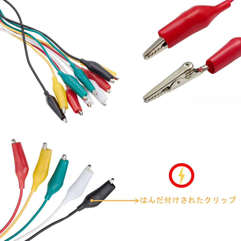【パッケージ内容】5色10本セットワニ口クリップセット付きテストリード。 カラー:黒、白、赤、緑、黄色各色2個。ケーブル長さ50cmです。