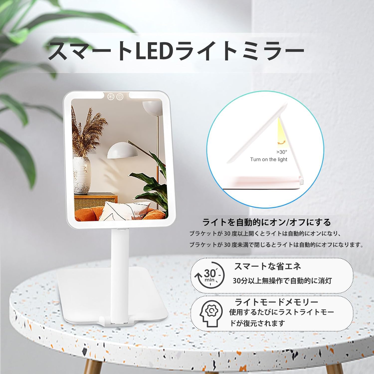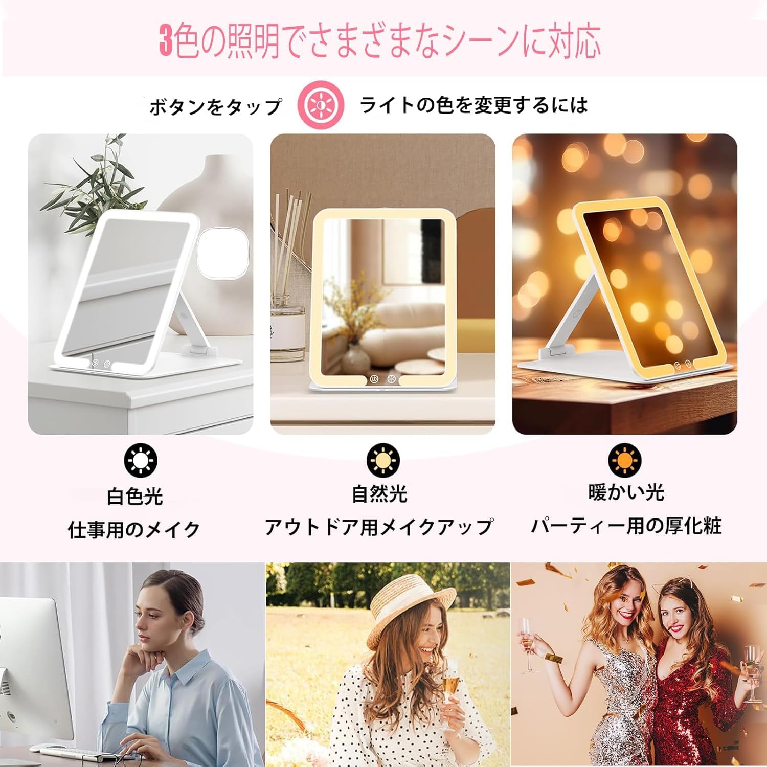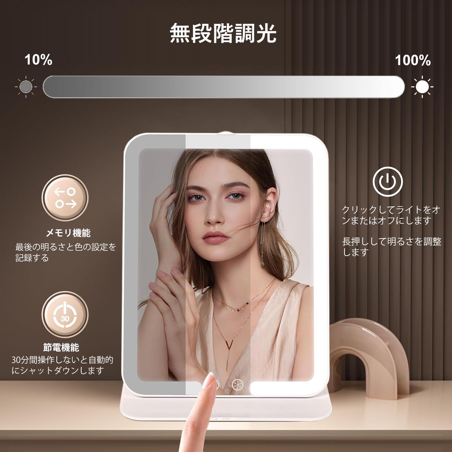 【3色のライト&無段階の明るさ】ワンタッチでライトをオンオフし、電球色・白色光・自然光といった照明モードも簡単に切り替え可能です。更に、無段階調光機能をサポートしており、長押しで明るさを自由に調整することができます。どのような状況でも、最適な光量でメイクを仕上げることができます。初心者から上級者まで、どんな場面でも完璧なメイクを実現することができる化粧鏡です。