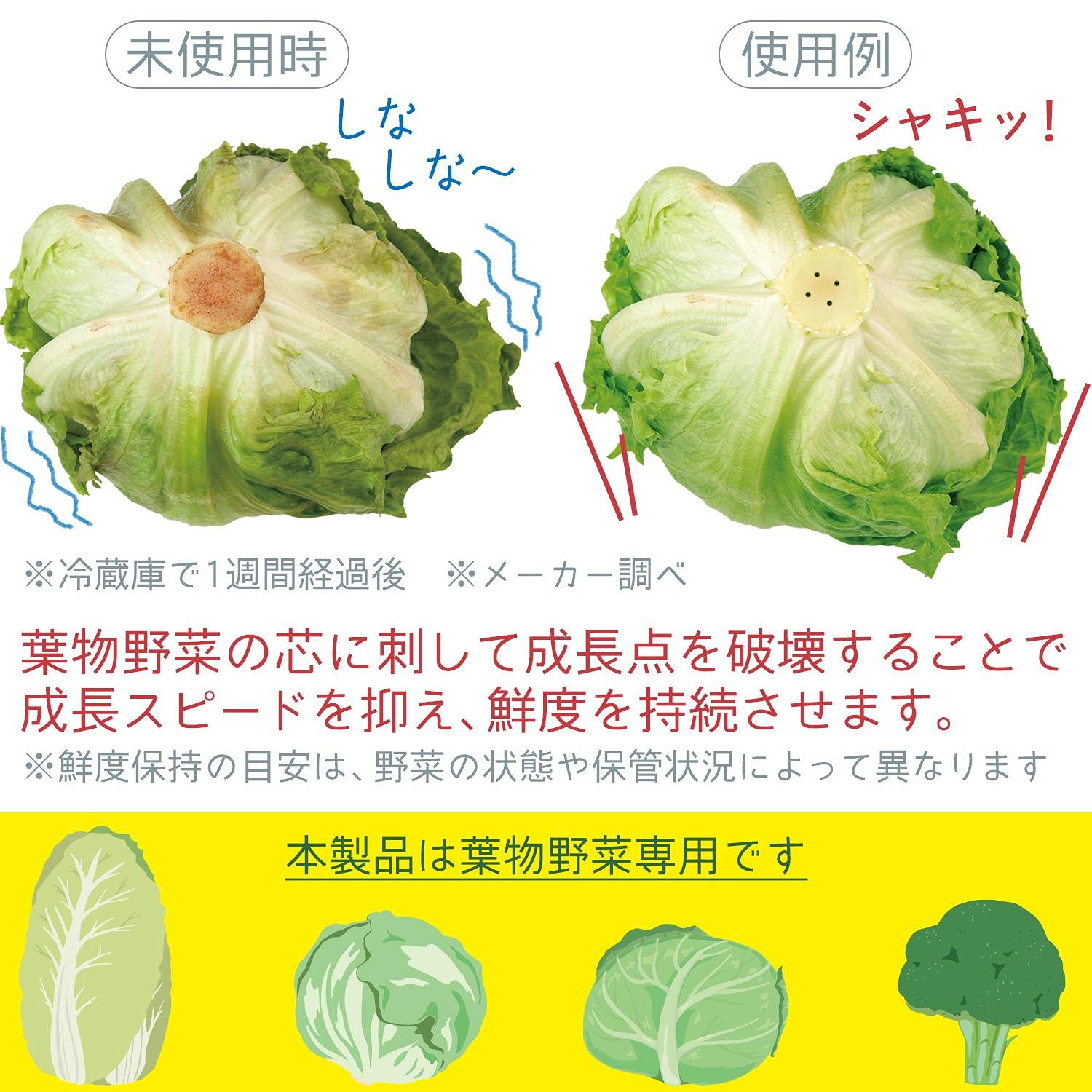 「野菜鮮度キーパー」は葉物野菜の芯に刺して成長点を破壊することで成長スピードを抑え、鮮度を持続させます