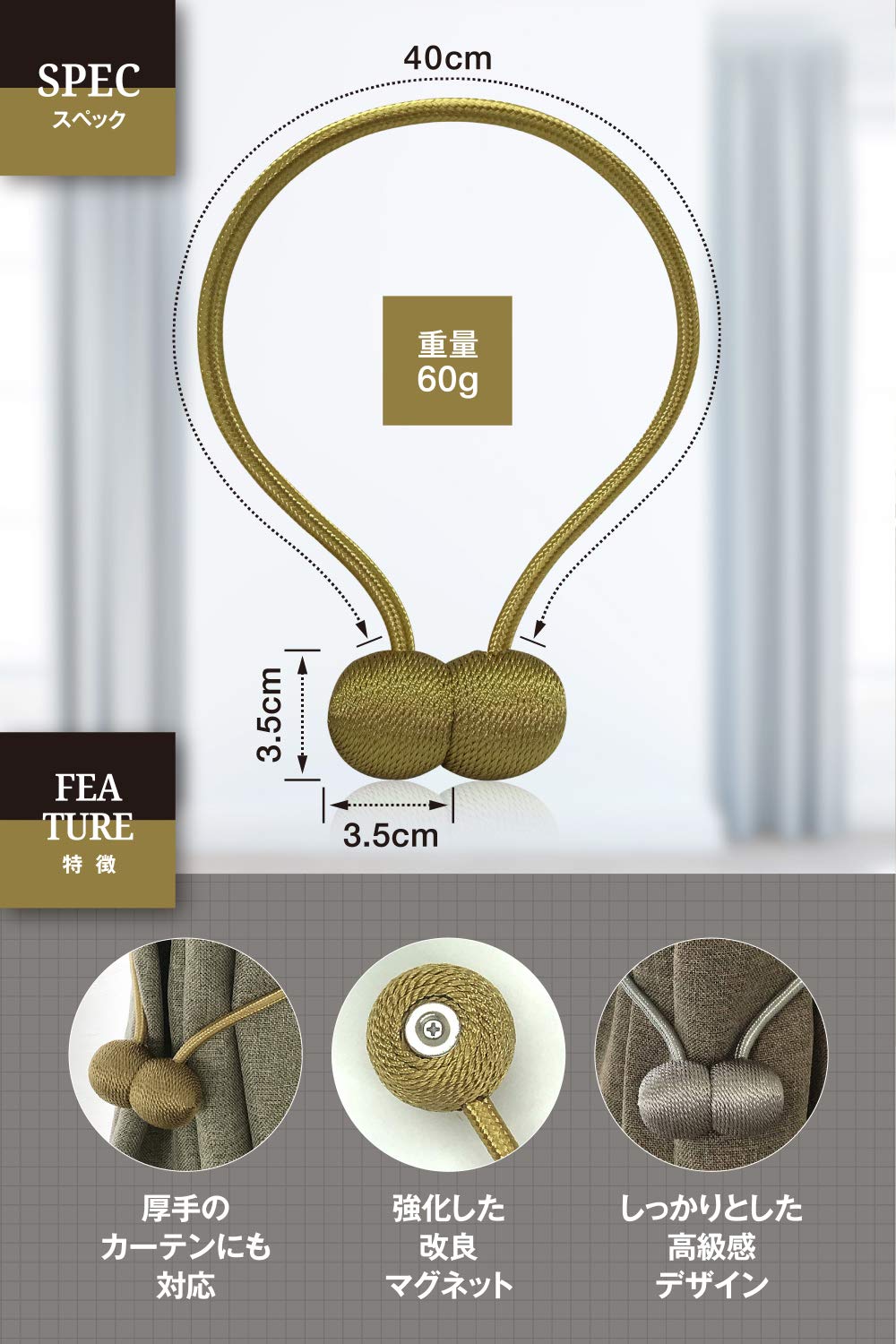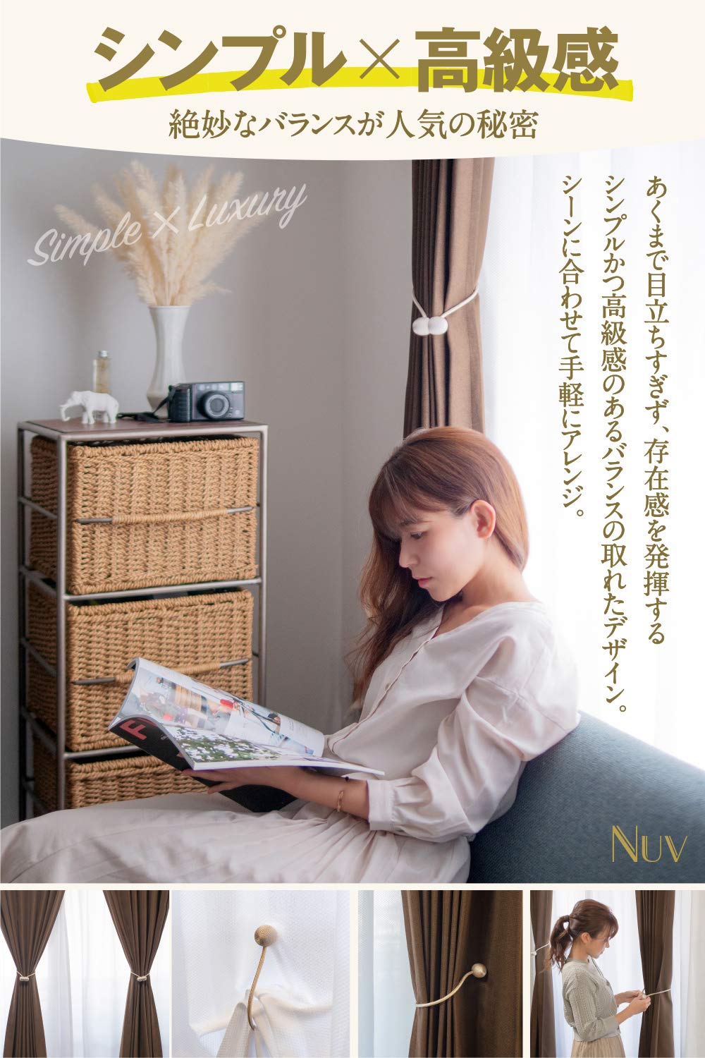 穴あけ不要。お部屋の雰囲気やカーテンの機能を損なう事のないマグネットカーテンタッセルです。