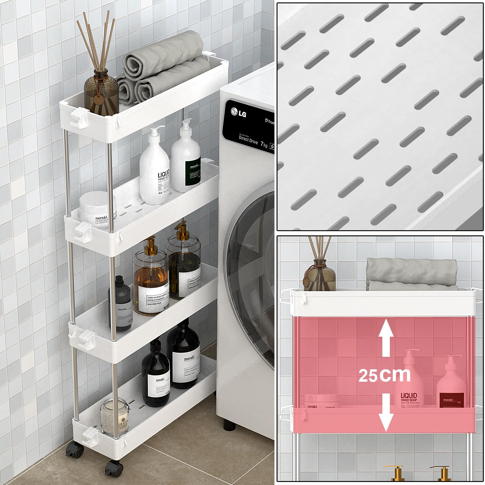 【頑丈&耐久性】軽量で丈夫な素材でできたワゴンで、ご底板は穴付きで通気性がよく、お掃除が簡単で、湿気が多い場所でも安心。また、落下防止フレーム付きがあり、小物や割れ物等落下の心配なく、ジャムなどの小さいものペットボトルなどの大きな物まで収納可能です。