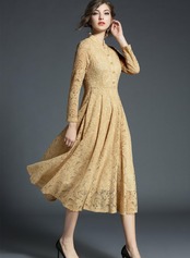 レース細工の透け感が優しい雰囲気に、上品な印象を演出する;袖丈は長袖、気になる二の腕も上手に隠せる;高めのウエスト切り替えで、脚長シルエットが完成します;ロング丈でも重たさを感じさせない、裾のレースがポイントです。