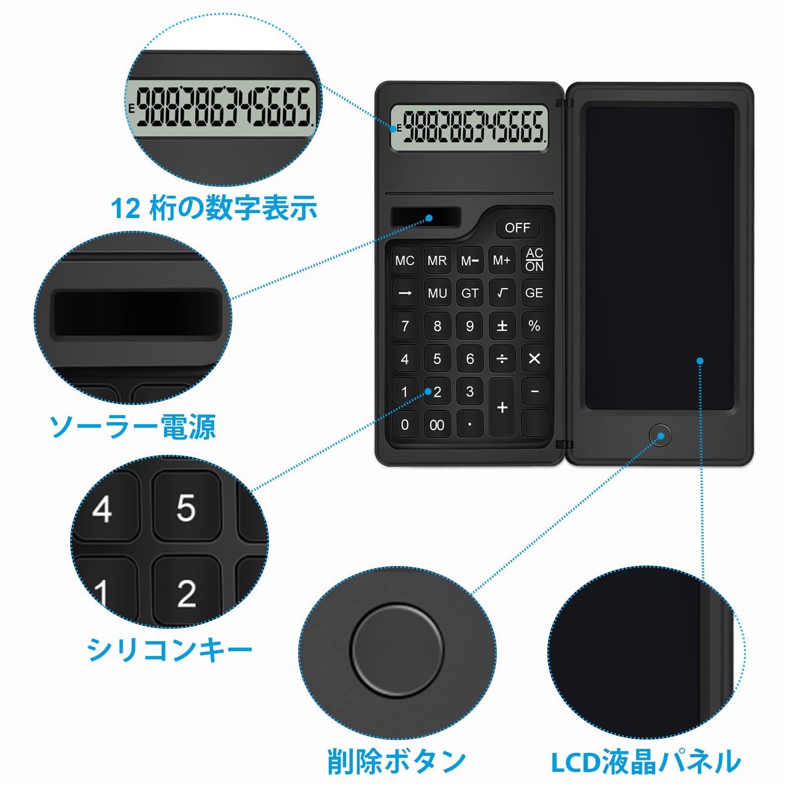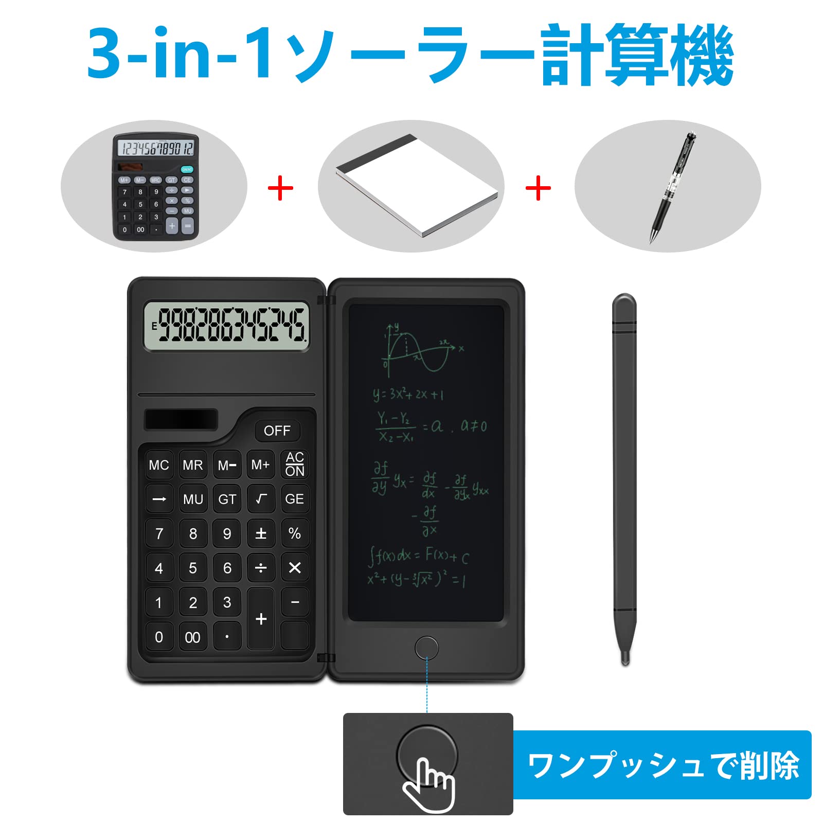 Lefon 電卓付き電子メモ 計算機&電子メモパッド2in1 電池式 12桁 ワンタッチ消去 オフィス、学生、仕事用 ビジネス用