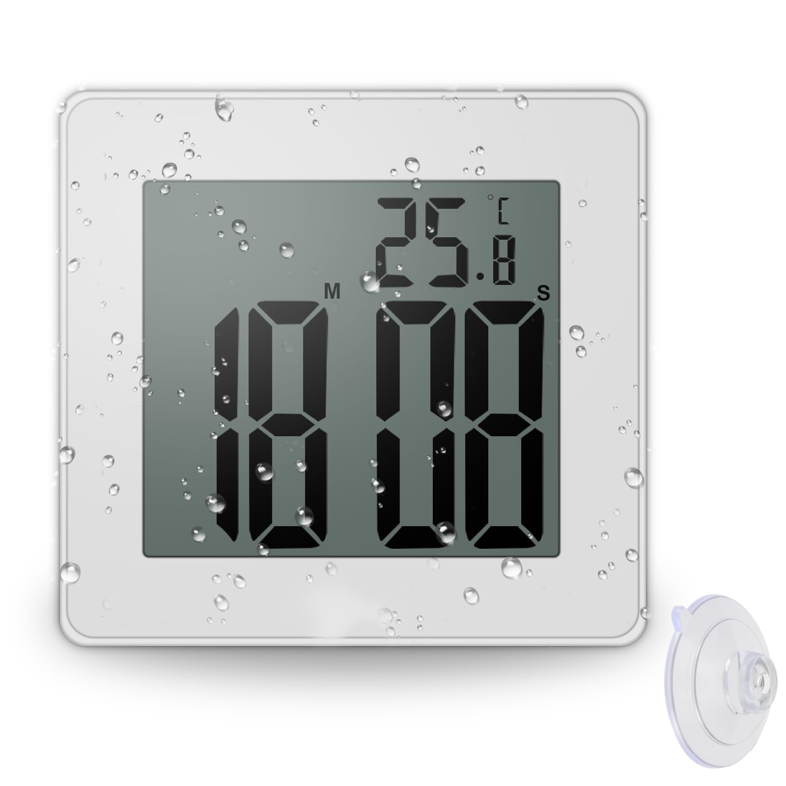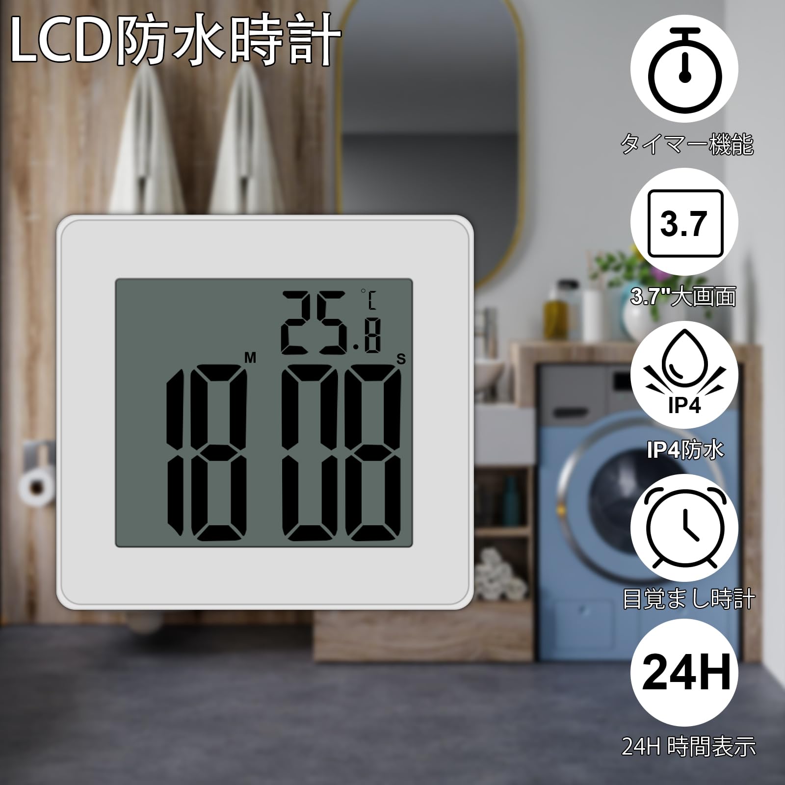 防水時計 LCD大画面 24H時間 温度表示 防水時計 お風呂用 吸盤付き (白)