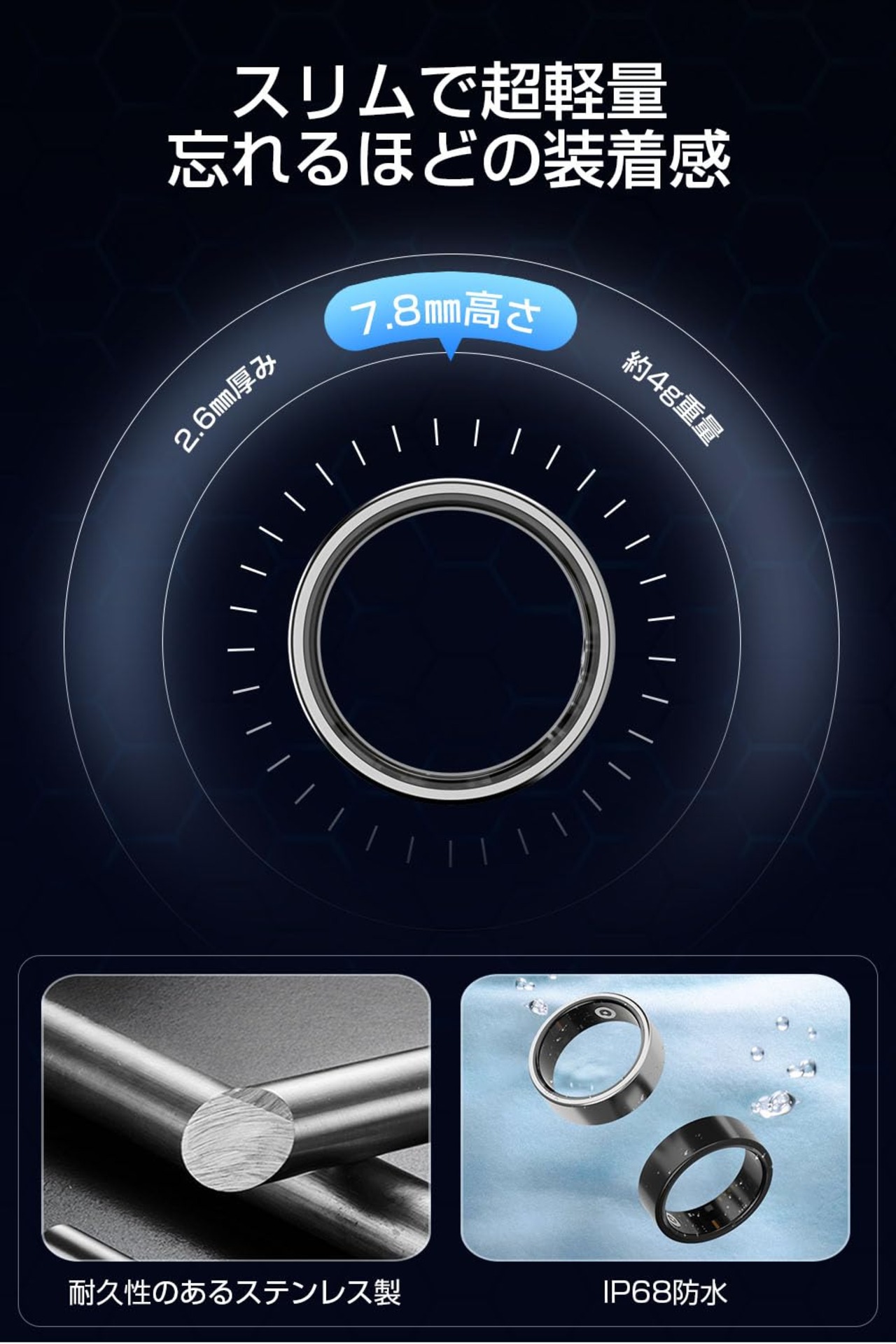 【睡眠管理と24h健康管理】 スマートリングの光学式センサー、重量センサー、赤色センサーによって、健康管理が可能です。夜間リングを付けたまま寝ると、翌日アプリより睡眠時浅睡眠、深睡眠、REM睡眠の時間帯、目覚めた回数などの睡眠の詳細が確認できます。睡眠の質評価とアドバイスも表示されます。また、他のデータも5分間ごとに精密で持続的に測定し、一日中のデータの詳細も確認でき、あなたのフィットネス目標の達成をしっかりサポートします。