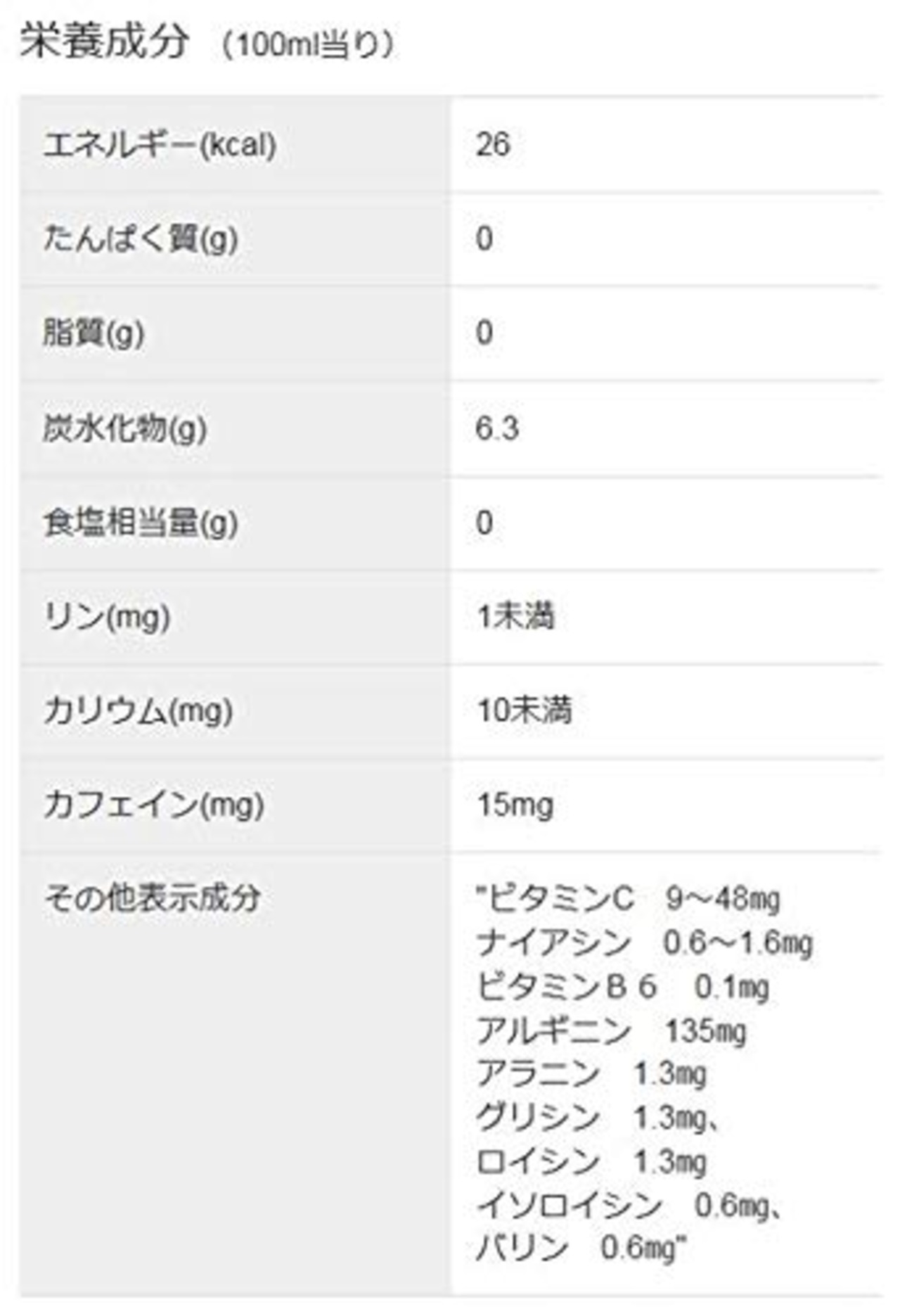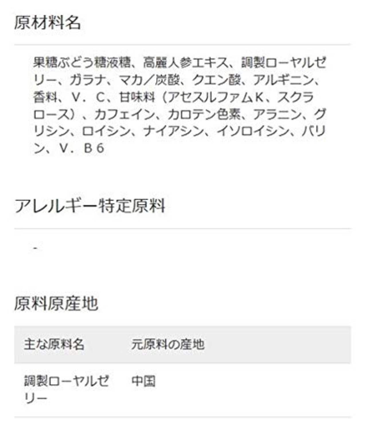 原材料:果糖ぶどう糖液糖、高麗人参エキス、調製ローヤルゼリー、ガラナ、マカ、クエン酸、香料、アルギニン、V.C、甘味料(アセスルファムK、スクラロース)、カロテン色素、カフェイン、アラニン、グリシン、ロイシン、ナイアシン、イソロイシン、バリン、V.B6