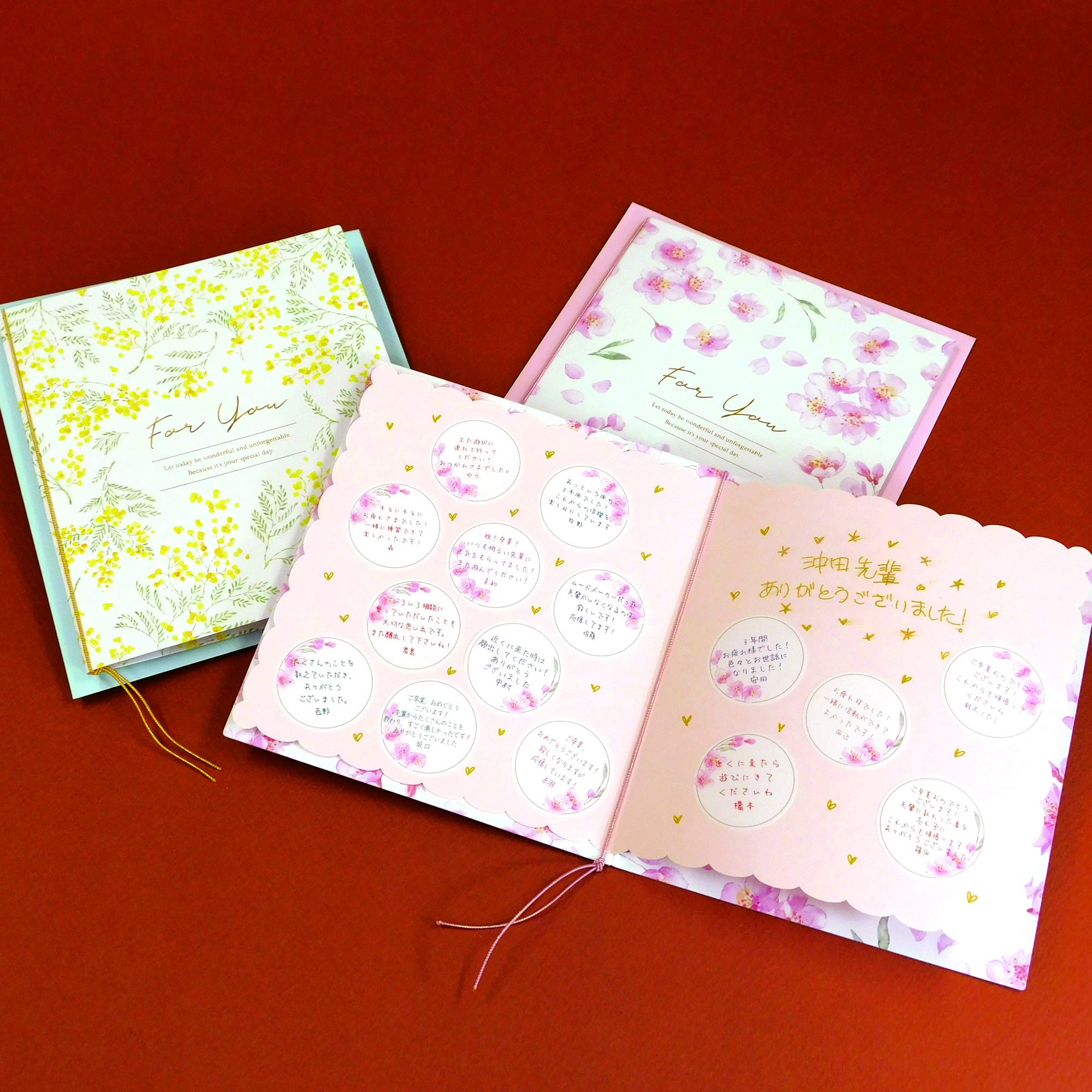 表紙の花模様がかわいい色紙。使い易いメッセージシール(15人分)付き。