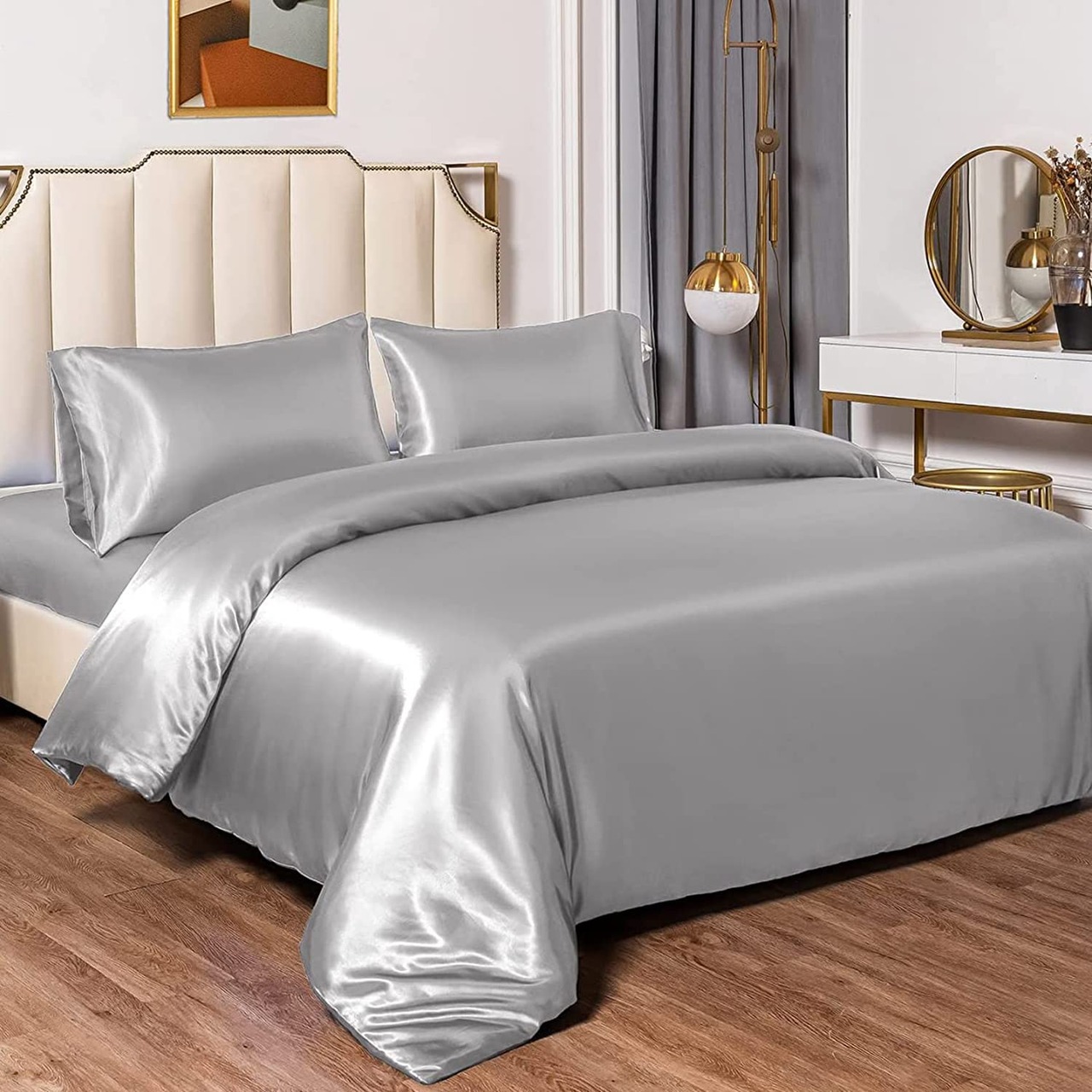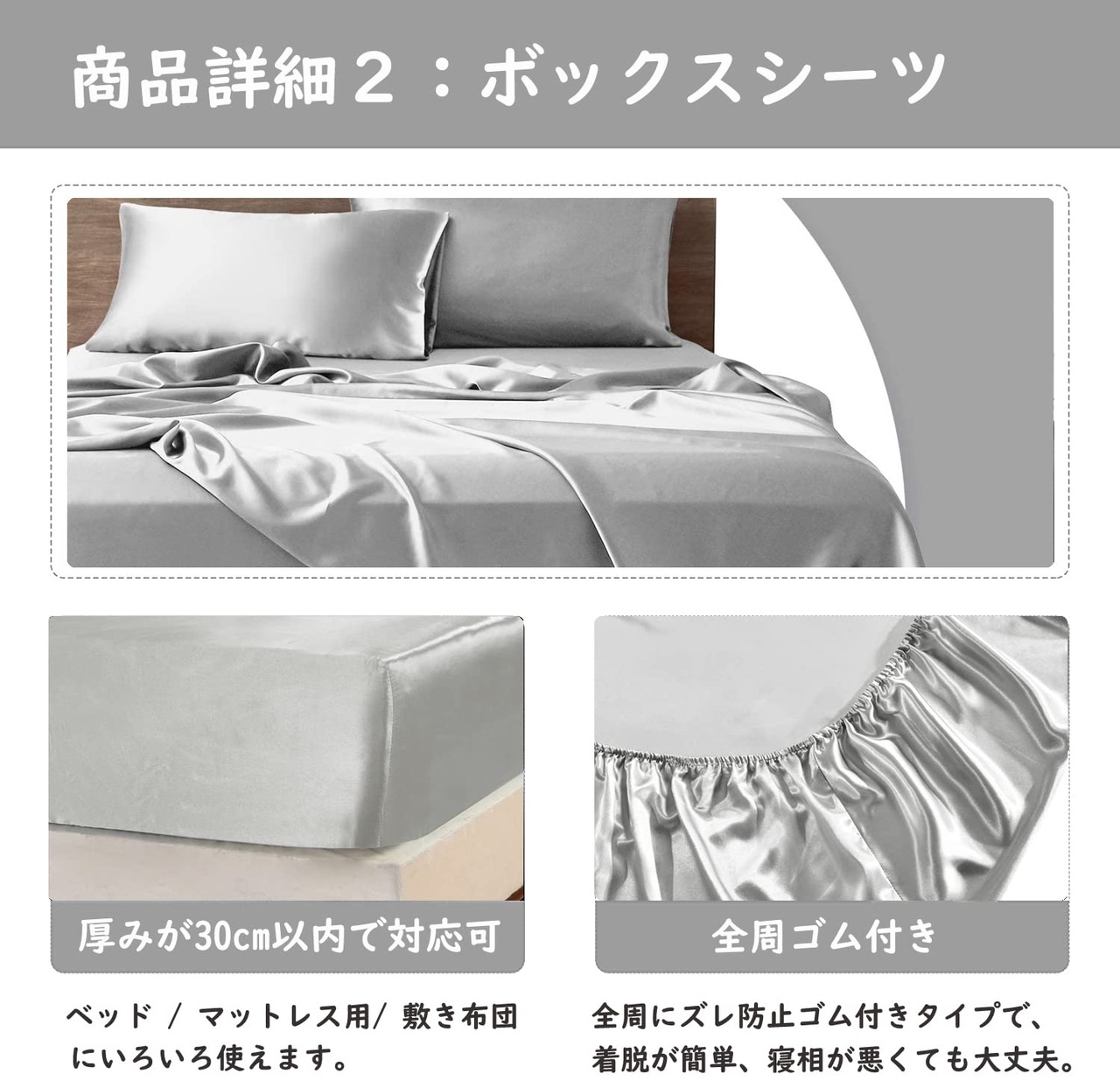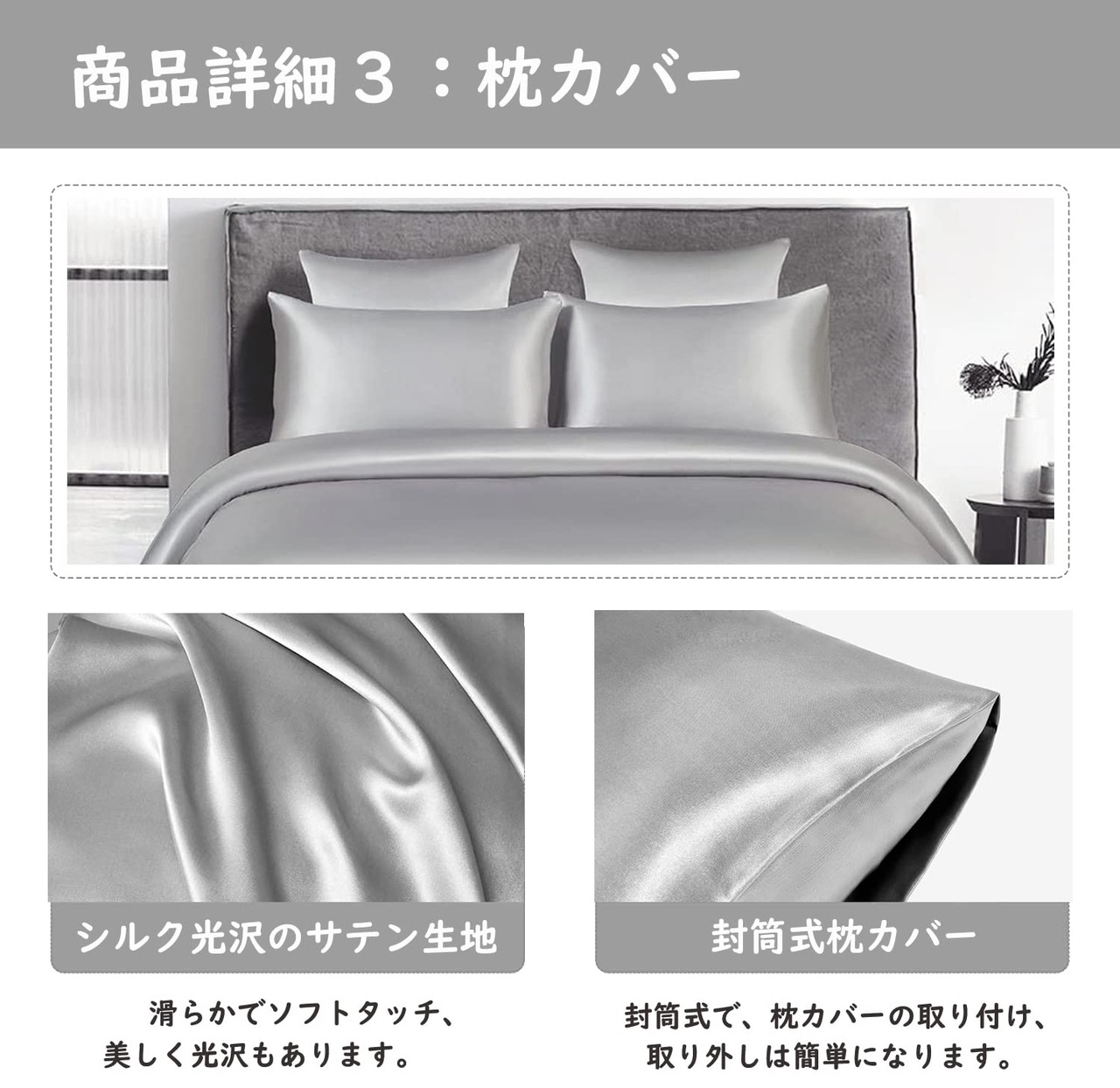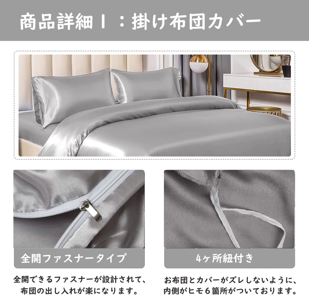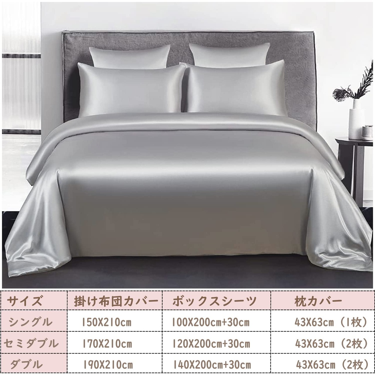布団カバー セミダブル 4点セット サテン 布団カバー ベッドカバー 枕カバー ベッドシーツ ボックスシーツ 洋式・和式兼用 滑らかな材質 ライトグレー