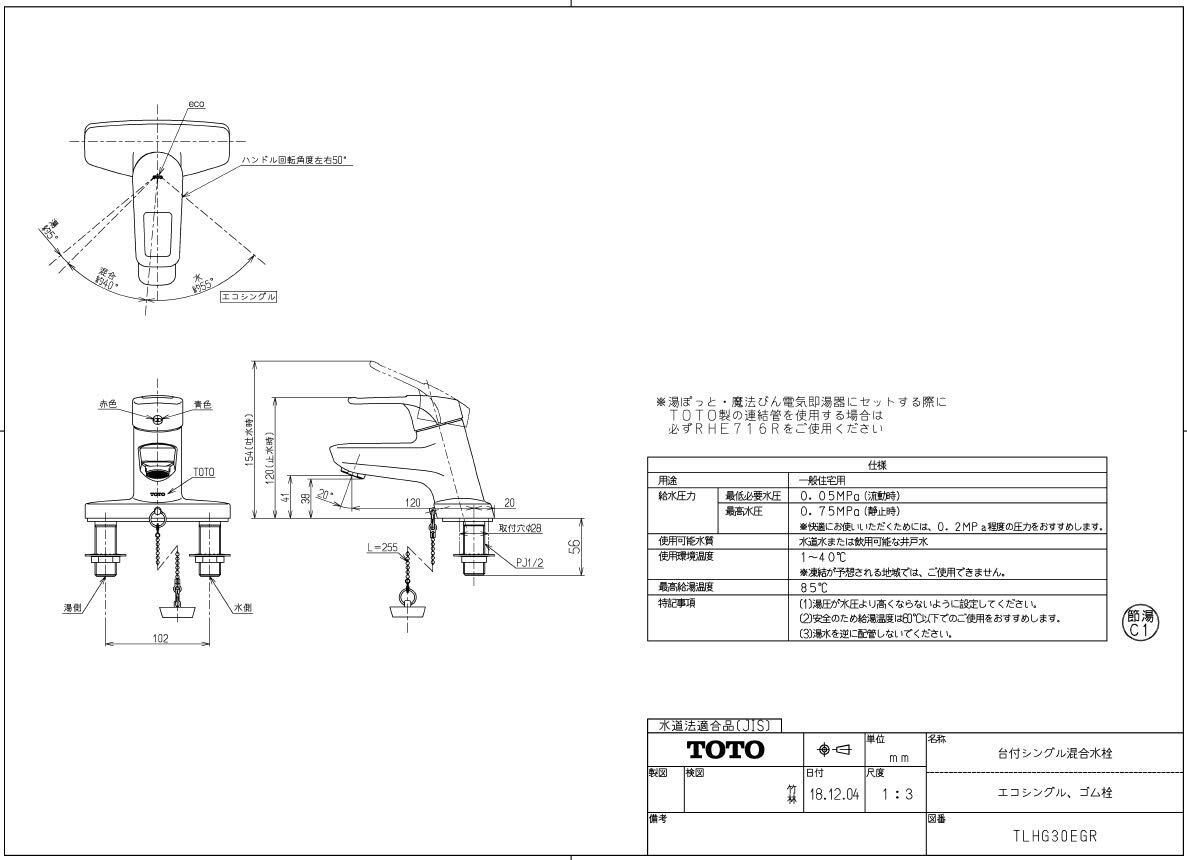 TOTO 洗面所水栓 台付2穴・エコシングル ゴム栓式(取替用) TLHG30EGR