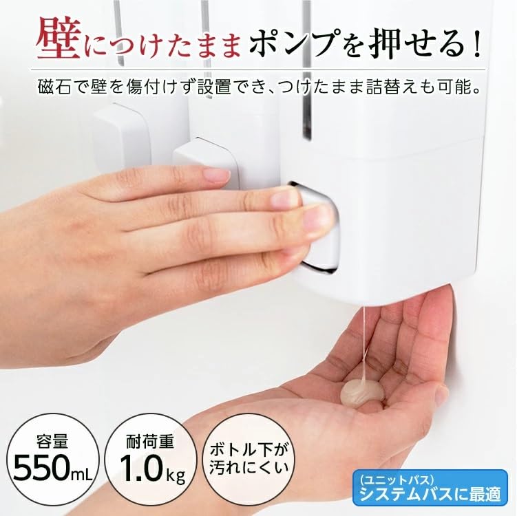ワンプッシュで適量約3mlの吐出量。液切れがよく、たれにくい。壁に付けたままスムーズな詰め替え