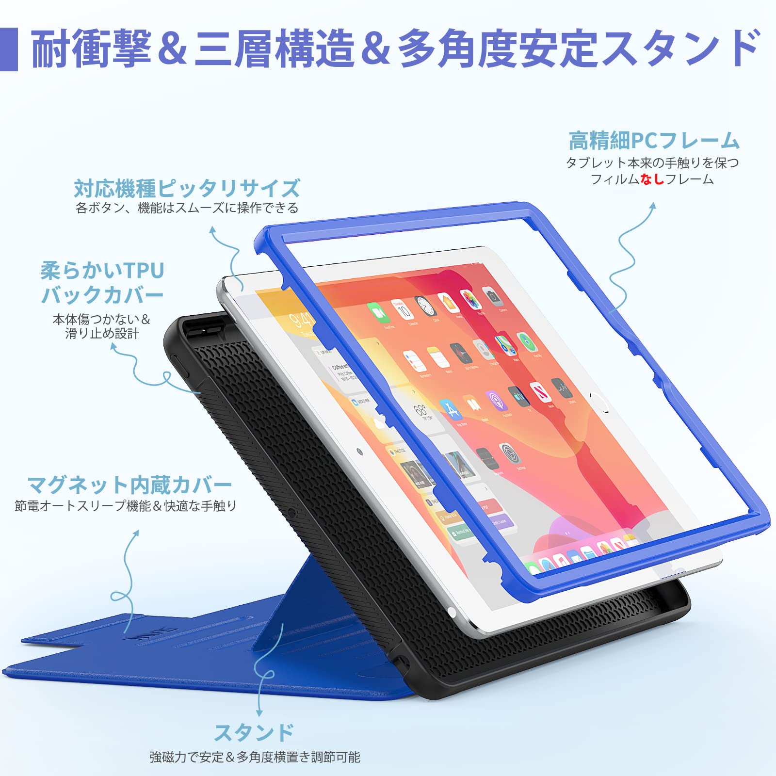 SEYMAC stock ケース iPad 9/8/7世代(2021/2020/2019) 10.2インチ ケース 耐衝撃 多角度横置き調節 オートスリープ ペン収納 カード収納 強磁力全面保護カバー(ブルー)(適格請求書発行事業者)