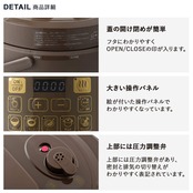 【機能】調理容量:約1.5L/ 呼び容量(満水容量):約2.5L、定格消費電力:700W、使用最高圧力:70kPaゲージ圧 ワンタッチメニューモード(5メニュー)、マニュアルモード、保温機能(最大12時間)、スロー調理モード(最大12時間)、あたためモード