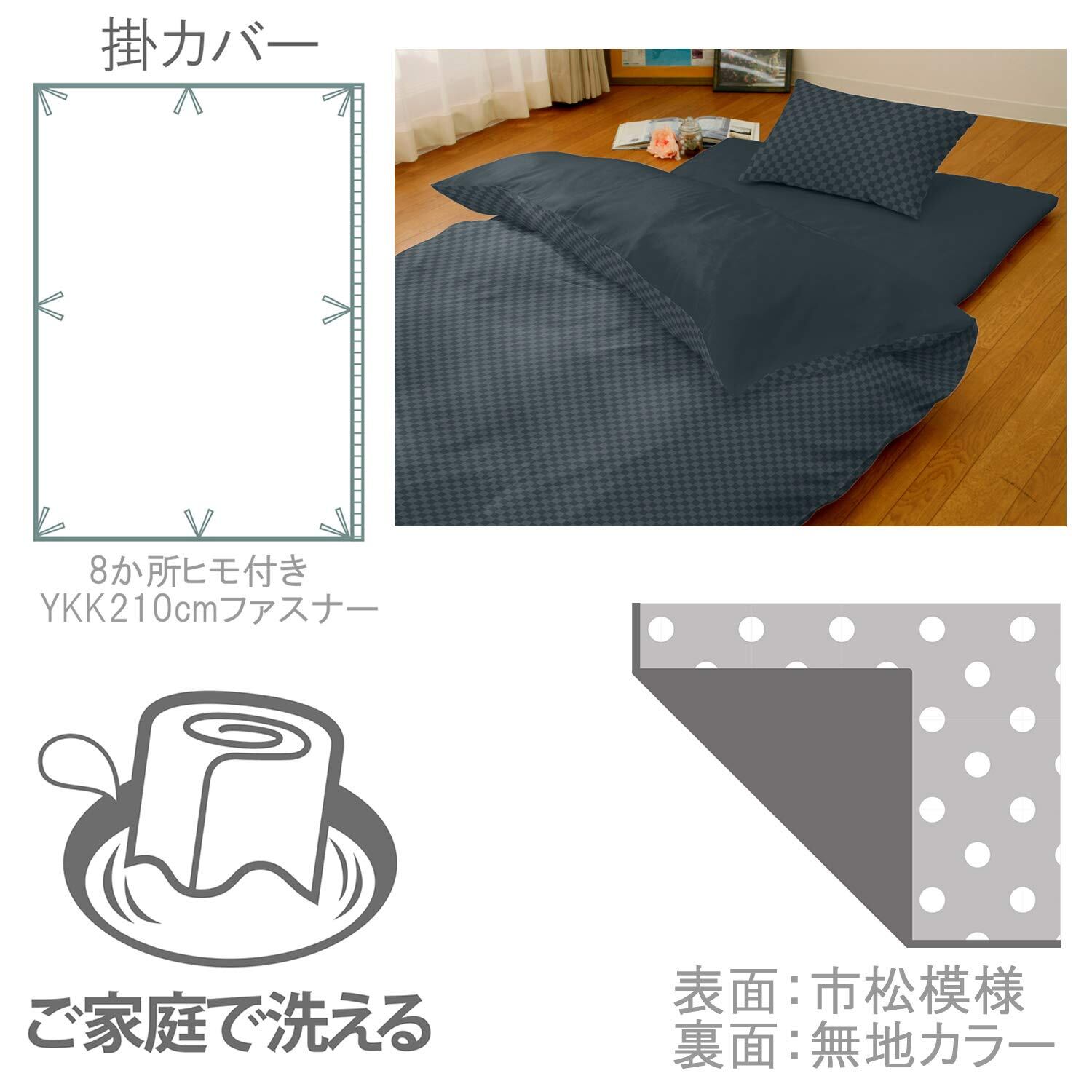 掛布団カバーの内側は8か所ヒモ付き。布団とつなげて使用中のズレ防止。<br>掛・敷布団カバーは布団の出し入れがしやすい片側全開ファスナー。<br>枕カバーは合わせ式。(ファスナー無)