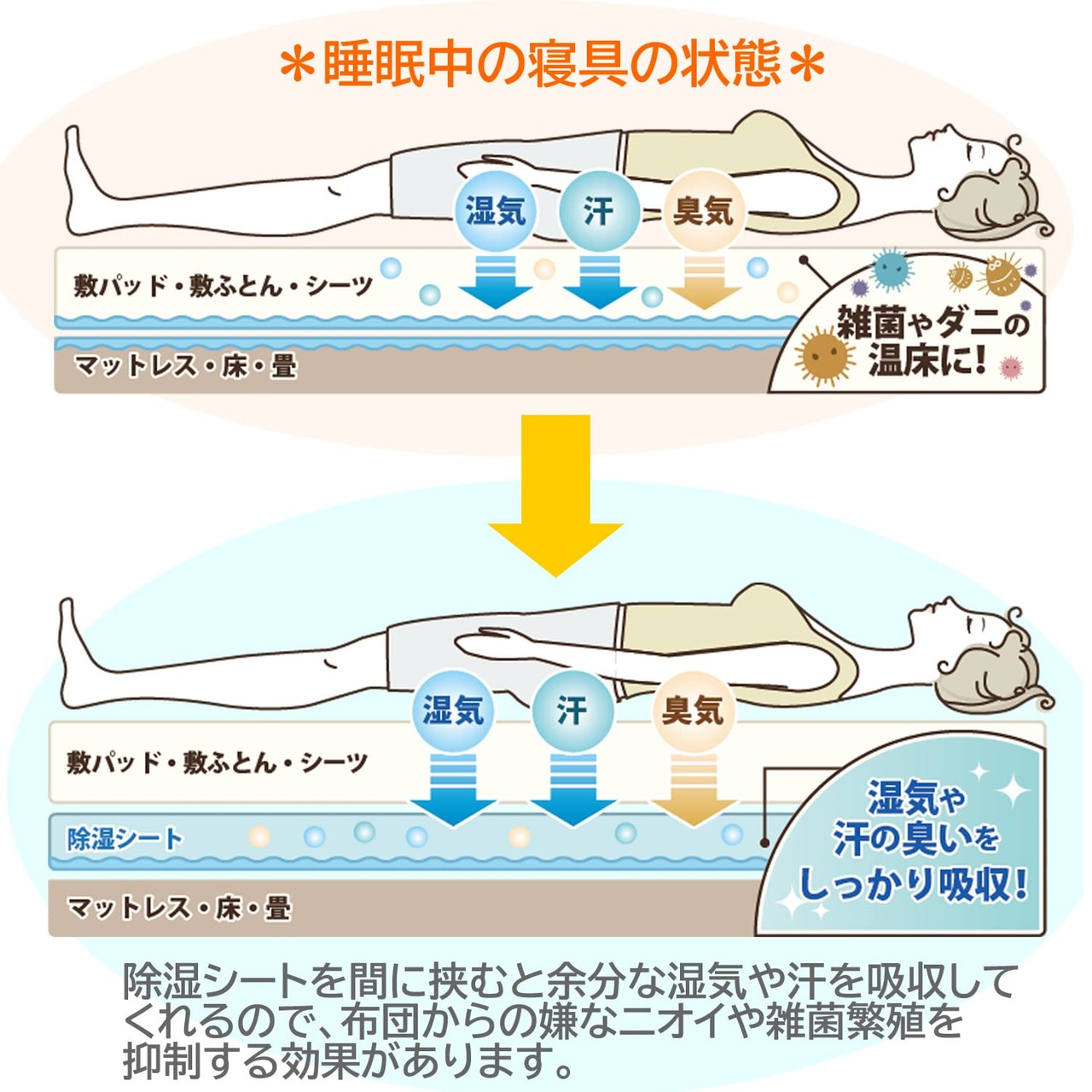敷き布団やベッドパッドの下等気になるところに 敷くことで、自然な吸湿力を持つシリカゲルが湿気やニオイを吸収します。