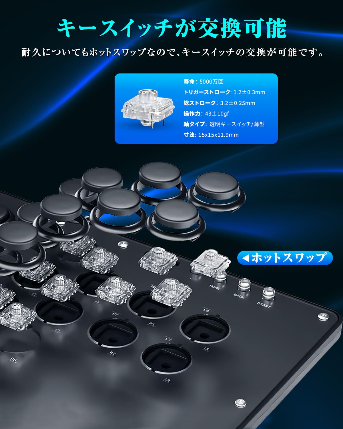 【PS4/PS5接続時の注意点】 接続時は公式サイト(haute42.com/supports/)またはマニュアルを参照してください。PS5/XBOX接続時は専用コンバーターが別途必要です。カスタムキーM1/M2は同機能ですが、ブラウザ(192.168.7.1)からキー割り当て変更可能。ホットスワップ対応でスイッチ交換も簡単です。