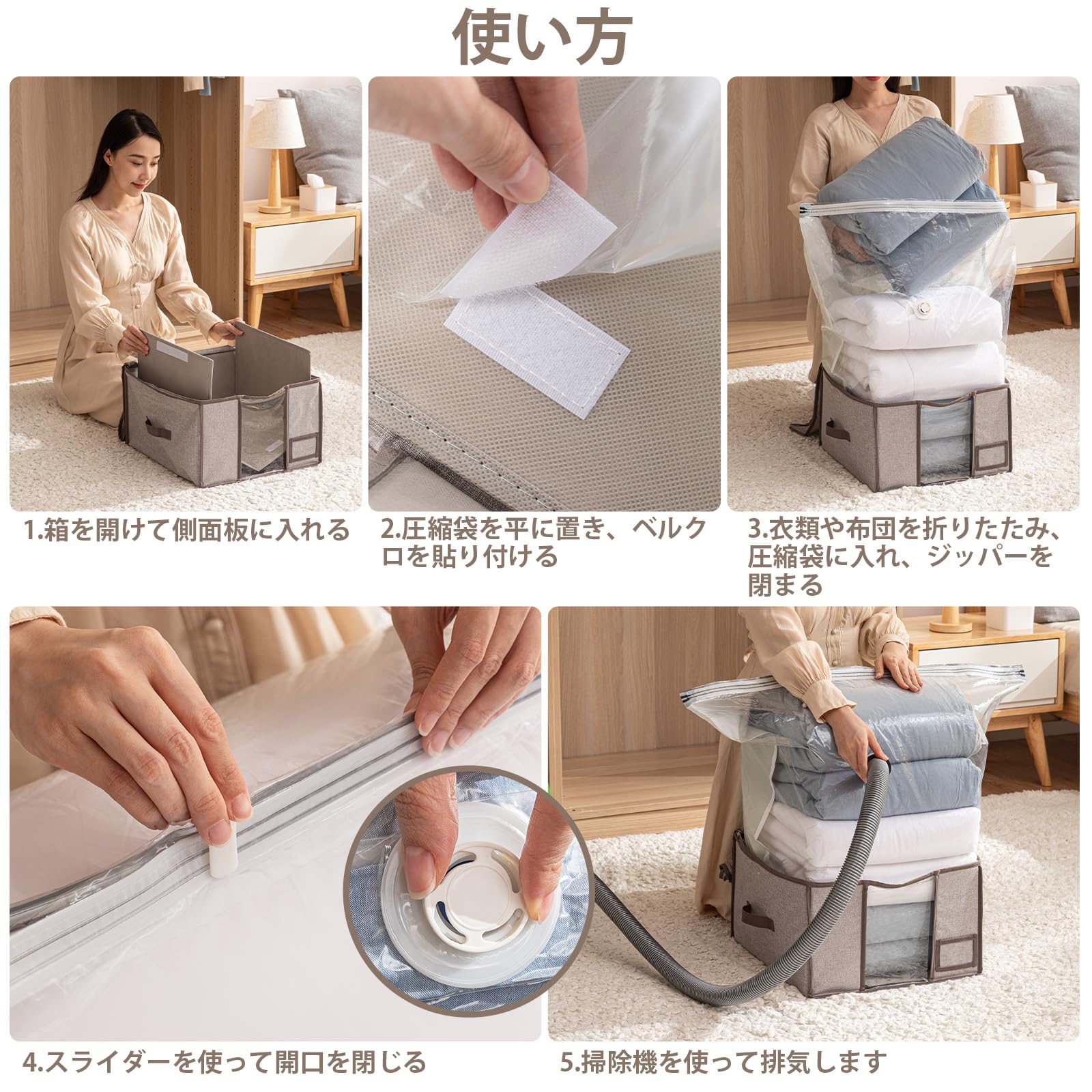 収納力に抜群:収納ボックス(1枚):40*42*25 cm ;圧縮袋(1枚):80*80*38 cm。収納目安:掛け布団を3 ~ 5枚、ダウンジャケットを8~10枚、衣類を20~25枚収納できます。圧縮袋と収納ケースが一体に,容量を減らすだけでなく、クローゼットの中に美しく収納することができます