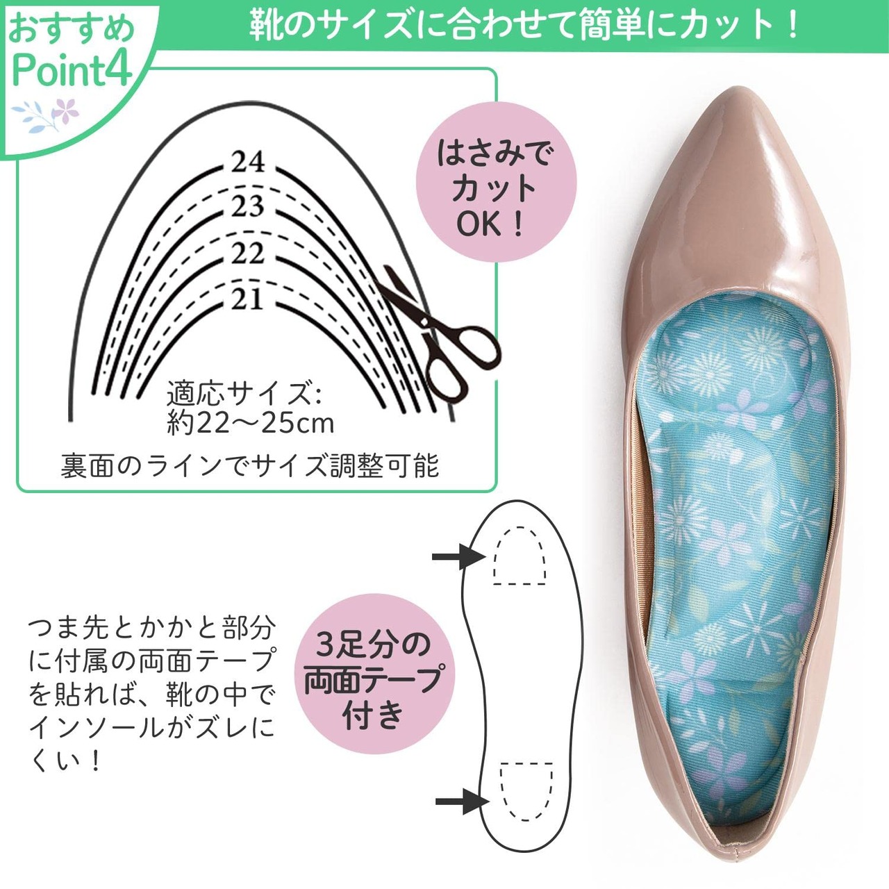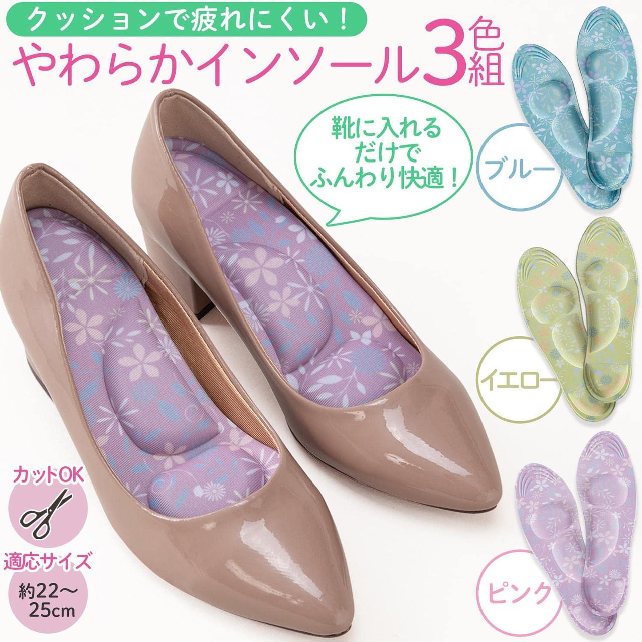 3つのやわらかいクッションで足裏をやさしくサポートするインソールです。