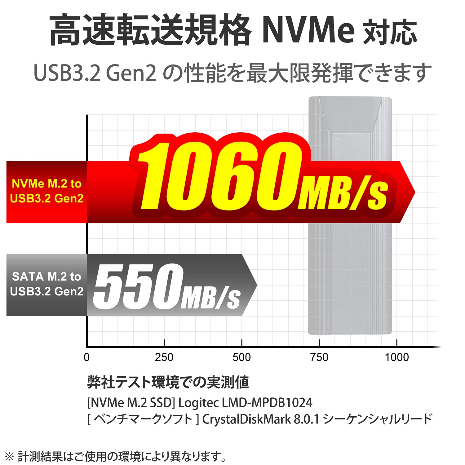 高速データ転送規格NVMeに対応しておりますので、USB3.2 Gen2の性能を最大限発揮できます。
