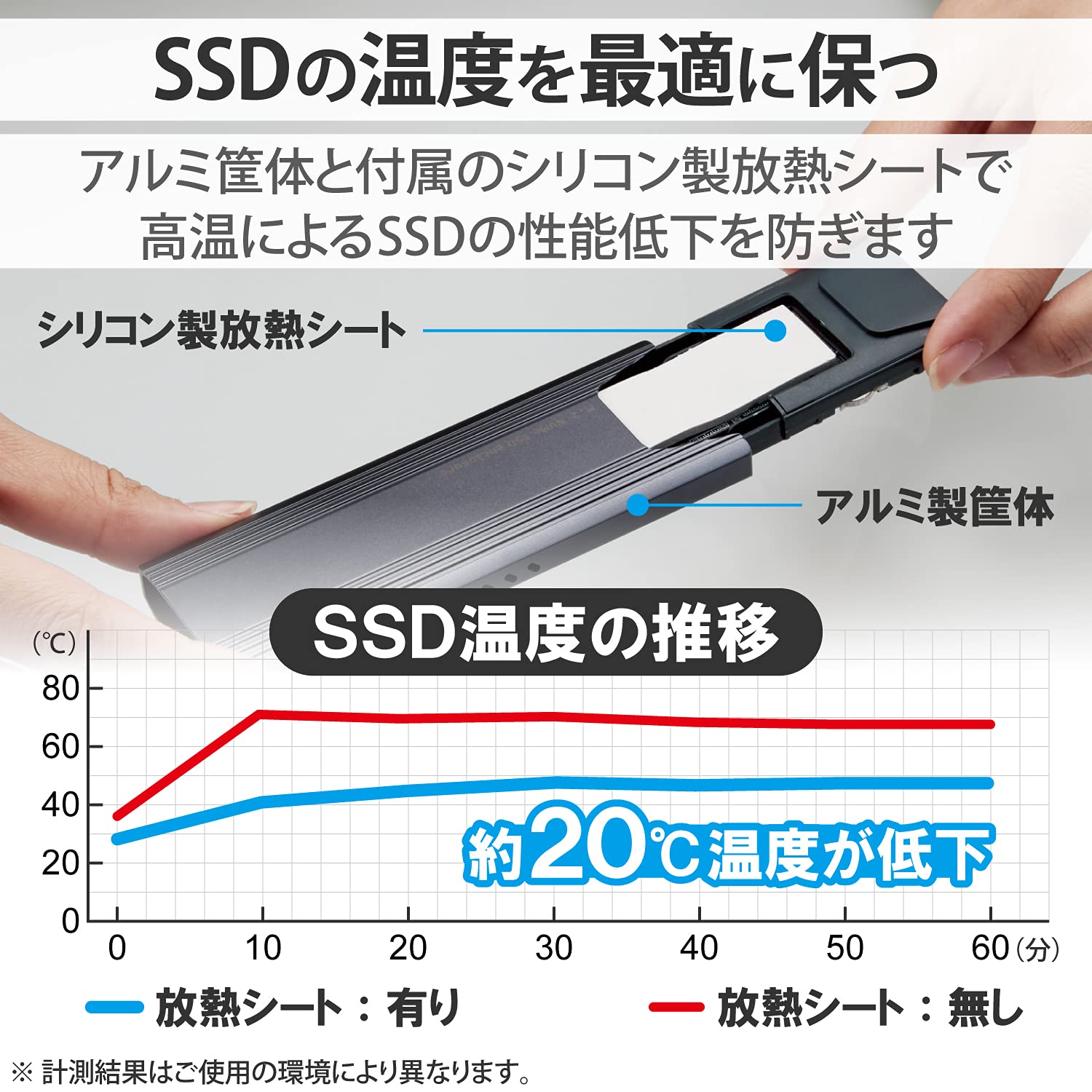 熱を逃がしやすいアルミ筐体&付属のシリコン製放熱シートで、高温になりやすいM.2 SSDの温度を最適に保ち、高温によるSSDの性能低下を防ぎます。