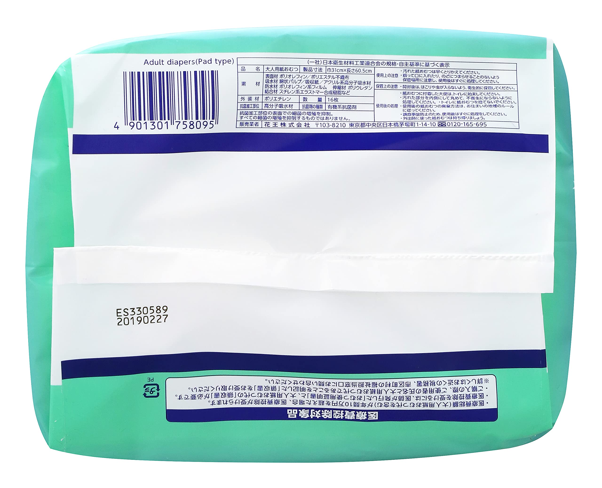 表面剤:ポリオレフィン系付繊布、吸水材:綿状パルプ/吸収紙/アクリル系高分子吸水材、防水材:ポリエチレンフィルム、伸縮材:ポリウレタン、結合材:スチレン系エラストマー合成樹脂
