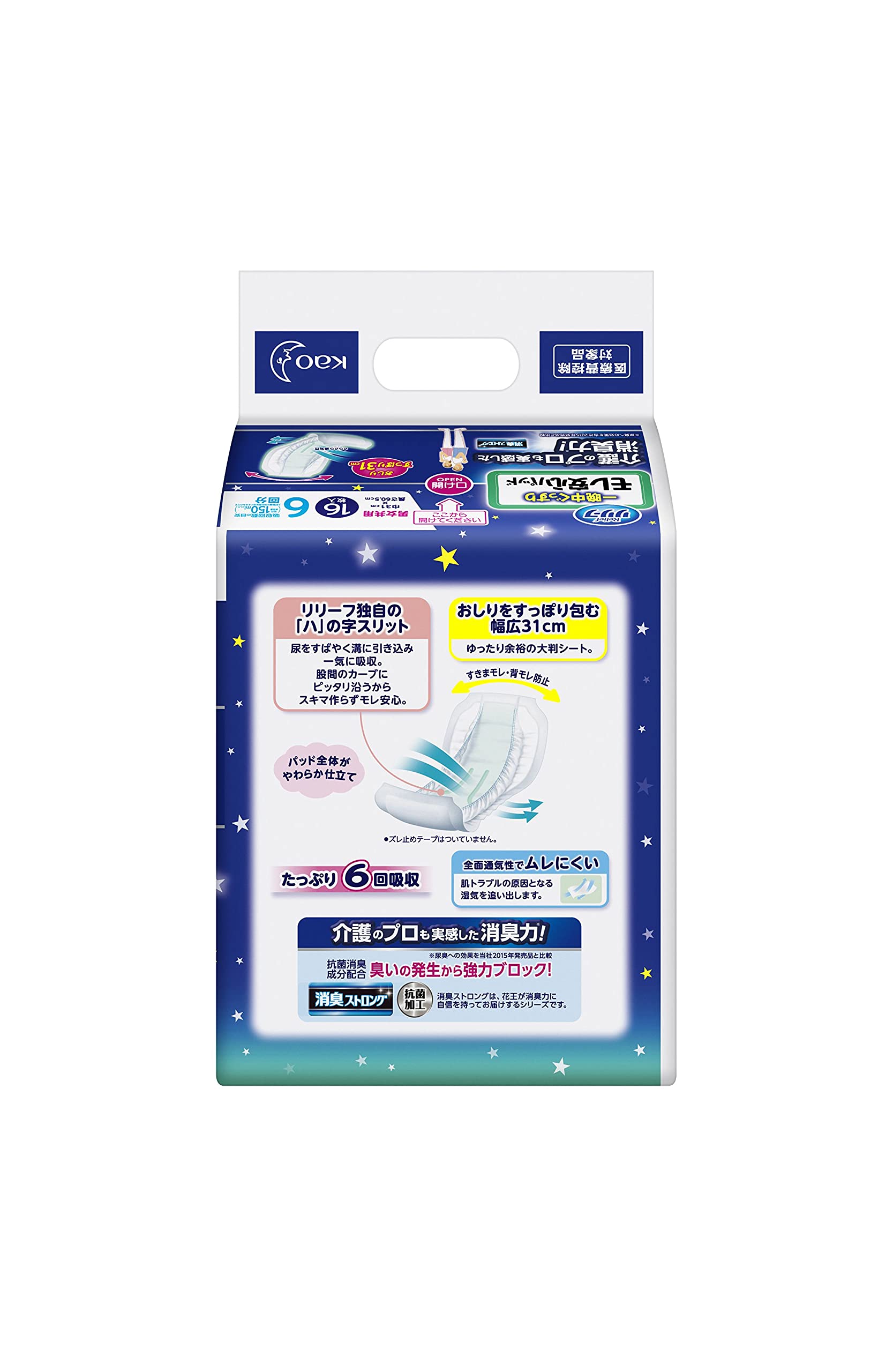 「リリーフ 尿とりパッド 一晩中さらさら16枚入」は、夜間のおしっこをワイドに吸収する尿とりパッド。おしりをすっぽり包み込む、長くて幅広い大判タイプです。湿った空気をどんどん外へ逃し、ムレやカブレを防ぐさらさら通気性シートを採用。おしっこを逆戻りさせず、表面をサラサラに保ってかぶれを防ぎます。更に、排泄後時間と共に増える雑菌の繁殖を抑えてニオイを防ぐ、消臭ケアシートも採用しています。約4cmの高さに立ち上がってしっかり塞き止める、横モレ防止ギャザー付き。16枚入り。