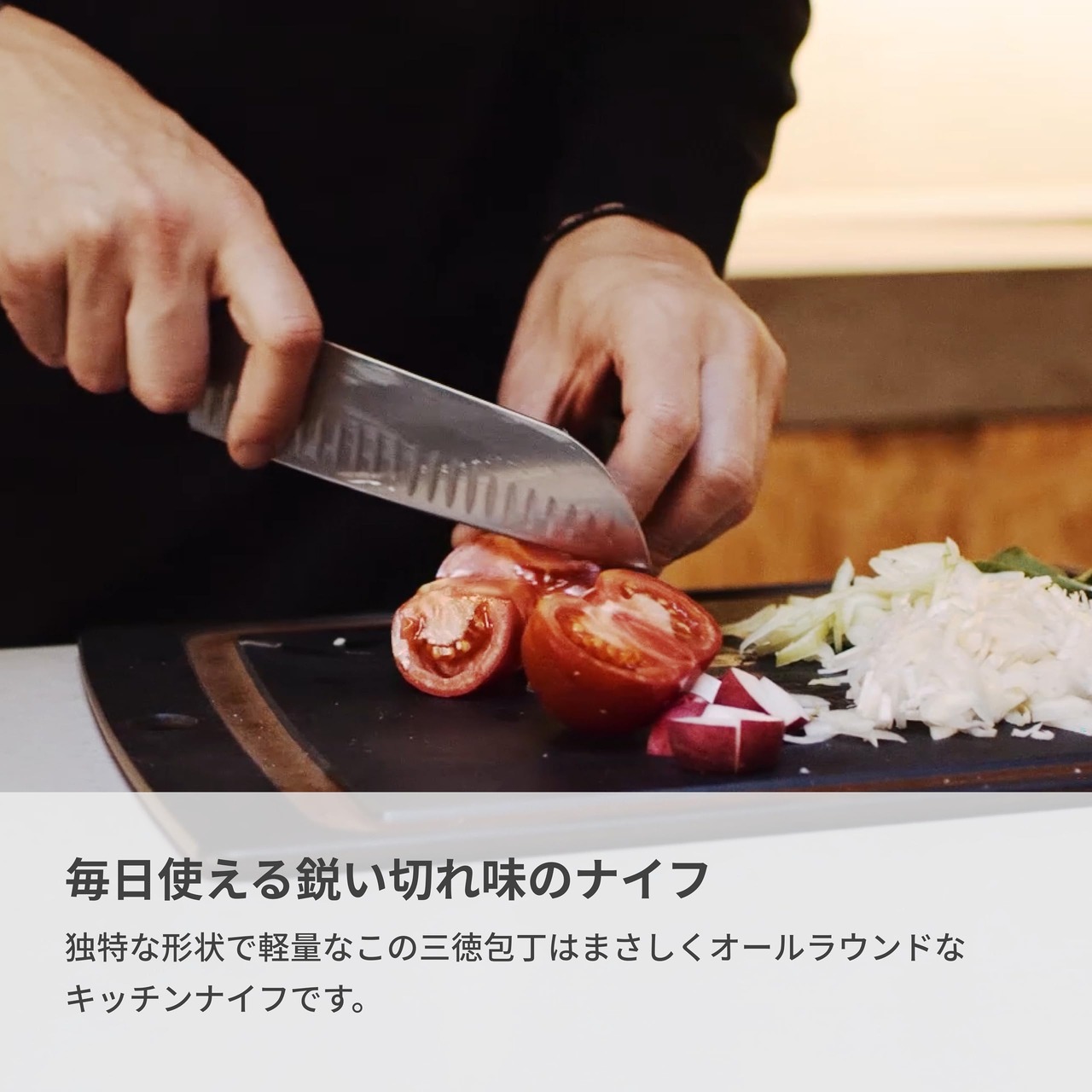 日本独自のスタイルで、肉や魚、野菜など料理全般に使えます。刃には食材の切り離れを良くしする溝が施されています。