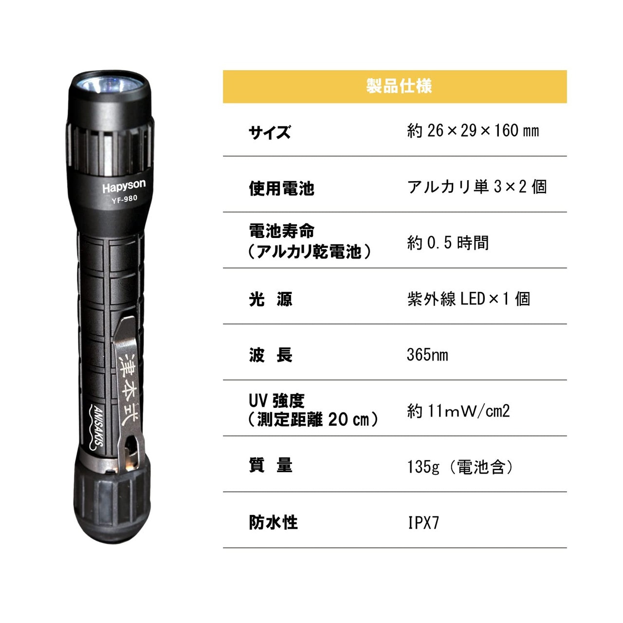 Hapyson(ハピソン)YF-980 アニサキスライト!!アニサキスを照らしだす!津本氏監修、アニサキスを見つけるブラックライト!完全防水の IPX7!!まな板や魚の身、内臓にいるアニサキスをクリアに映し出す光の波長!高透過紫外線レンズを採用!ハイパワーブラックライト!*使用上の注意:点灯状態のままにしないで下さい。光源部を直視しないでください。強力なUV光を発するため、失明や目の障害のおそれがあります。