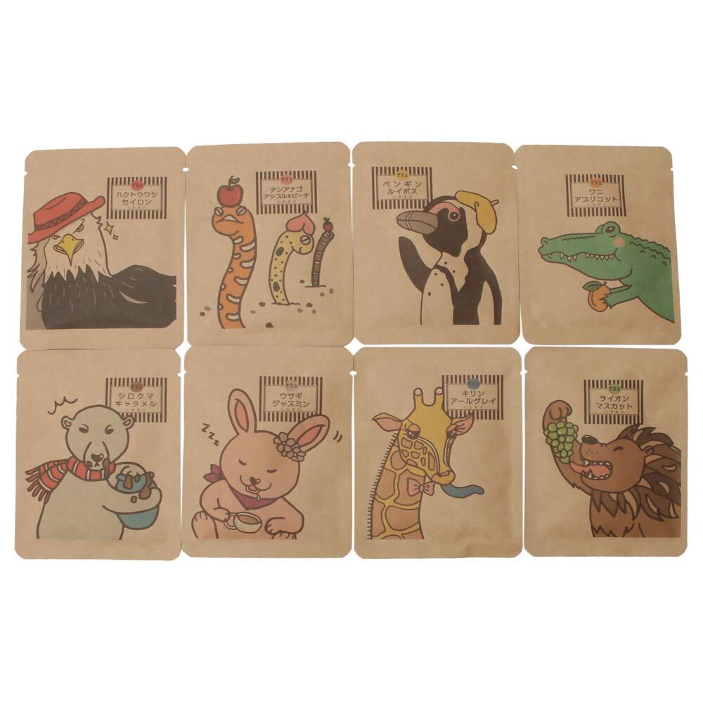 紅茶は8種類、各2包ずつで計16包。どうぶつの絵柄ごとに違います。・ アールグレイ ・ルイボス ・ジャスミン ・セイロン ・キャラメル ・マスカット ・アップル&ピーチ ・アプリコット