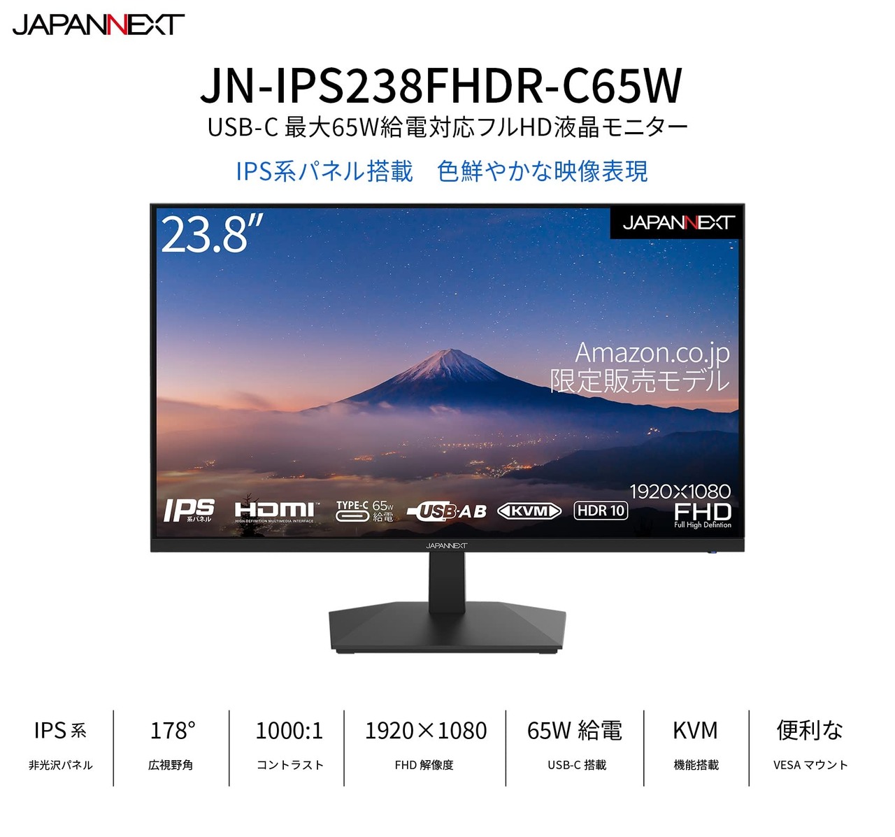 JAPANNEXT 23.8インチ モニター フルHD 1920x1080解像度 IPS ディスプレイ (KVM/HDMI/USB-C 給電 (65W) / スピーカー内蔵/VESA対応/ブルーライトカット) JN-IPS238FHDR-C65W