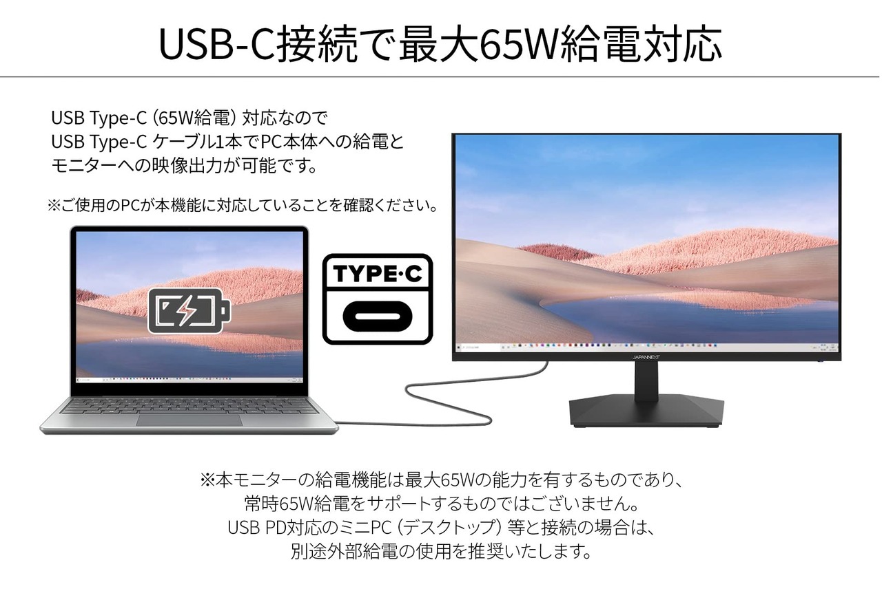 インターフェイスはHDMI1.4端子とUSB Type-Cの端子を1つ搭載しています。USB-C(最大65W給電)は、対応のPCであればUSB-Cケーブル1本でモニターへの映像出力とノートPCへの給電が可能。ケーブル1本でスッキリ接続出来るだけでなく、テレワーク、出社併用の場合などノートPCのACアダプターを持ち運ぶ必要が無くなります。