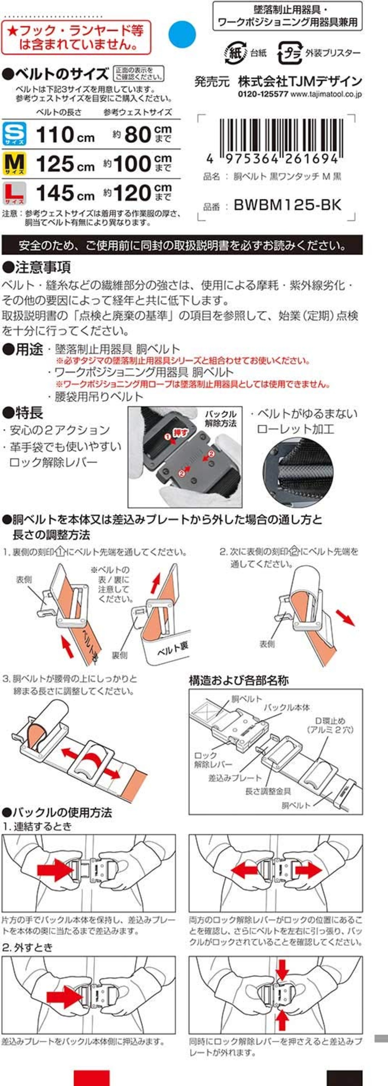 タジマ 新規格安全帯 胴ベルトMサイズ 黒 BWBM125-BK 長さ125cm 衝撃や耐久に強い鍛造ワンタッチ黒バックル 腰の強い特厚ナイロンベルト