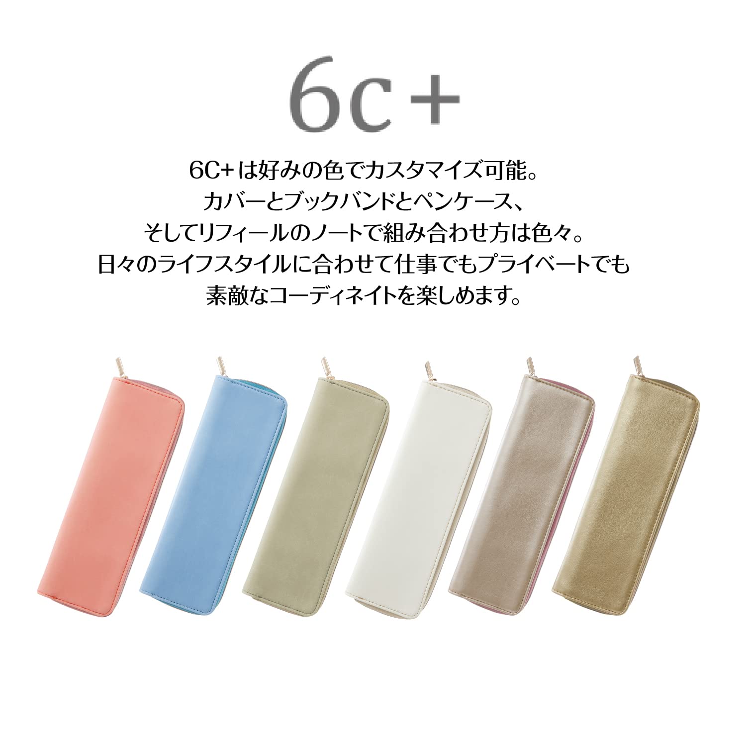 【その他】6C+は好みの色でカスタマイズできるノートです。カバーとブックバンドとペンケース、そしてリフィルのノートで組み合わせ方は色々。日々のライフスタイルに合わせて仕事でもプライベートでも邪魔にならないコンパクトサイズです。さらに、旅を満喫するノートとしても楽しめます。