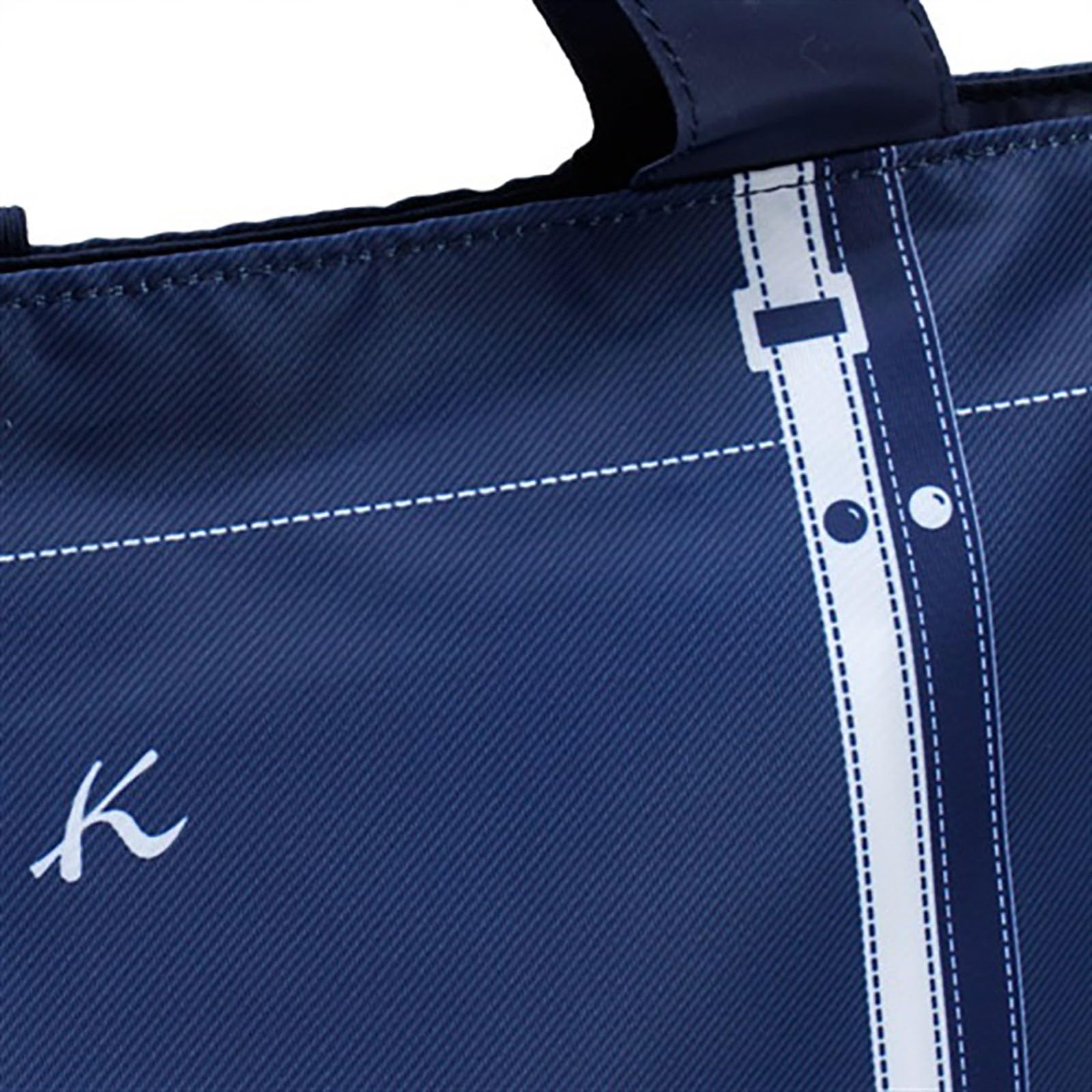 ダブルハンドルのデザインをプリントで表現した、だまし絵風の折りたたみバッグ。使いやすい舟形の形状で、収納力もあります。ファスナー付で口元がしっかり閉じられるのもポイント。縦に三つ折りし、下からクルクルと巻いてゴムで簡単にまとめることができます。