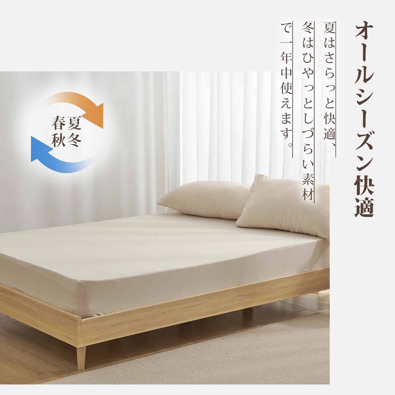 <通気性と速乾性>: 通気性が高いため、寝具の中で湿気がこもりにくく、快適な寝心地を提供してくれます。このボックスシーツは速乾性も優れています。洗濯後に素早く乾くため、洗濯の手間を軽減できますし、清潔さを保ちやすくなります。