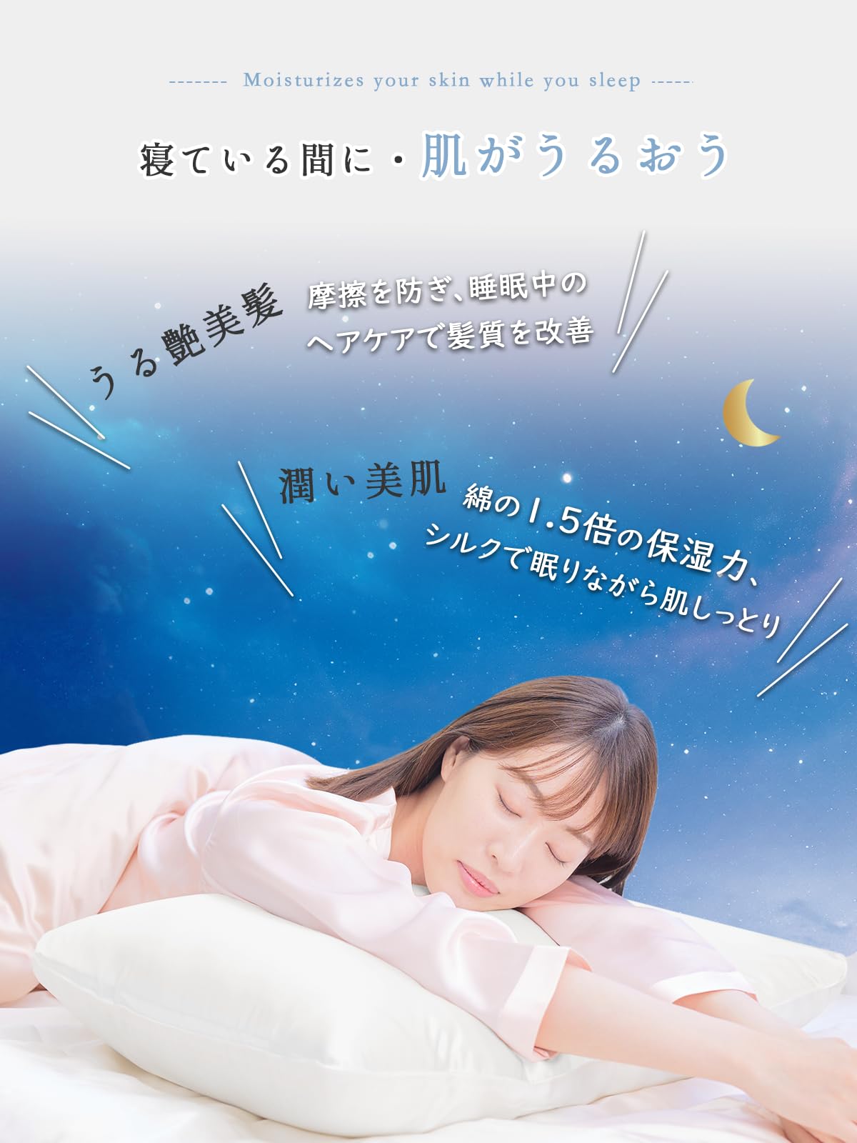 【スキンケア効果、肌の水分を守る】シルクには天然の保湿作用があり、睡眠中に肌の水分を保ち、乾燥や老化のサインを減少させます。シルクの微細な繊維が肌に潤いを与え、しわやシミの予防にも効果が期待できます。眠っている間に肌をしっかりとケアし、美しい肌を保ちます。