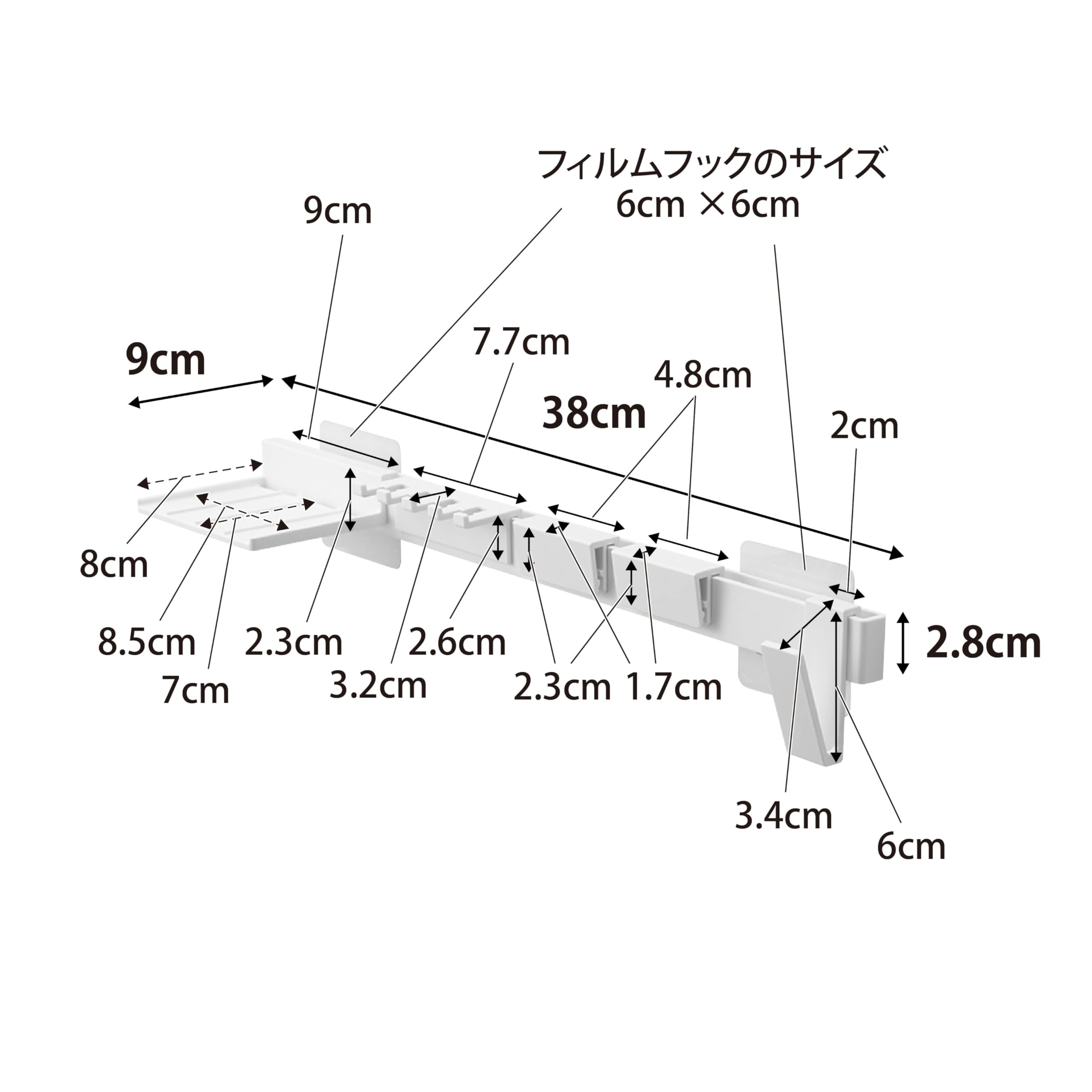 耐荷重:1.25kg(パーツ1つあたり:250g) ▪耐熱温度 本体:90℃ フィルムフック:60℃ ▪耐冷温度 本体・フィルムフック:-40℃