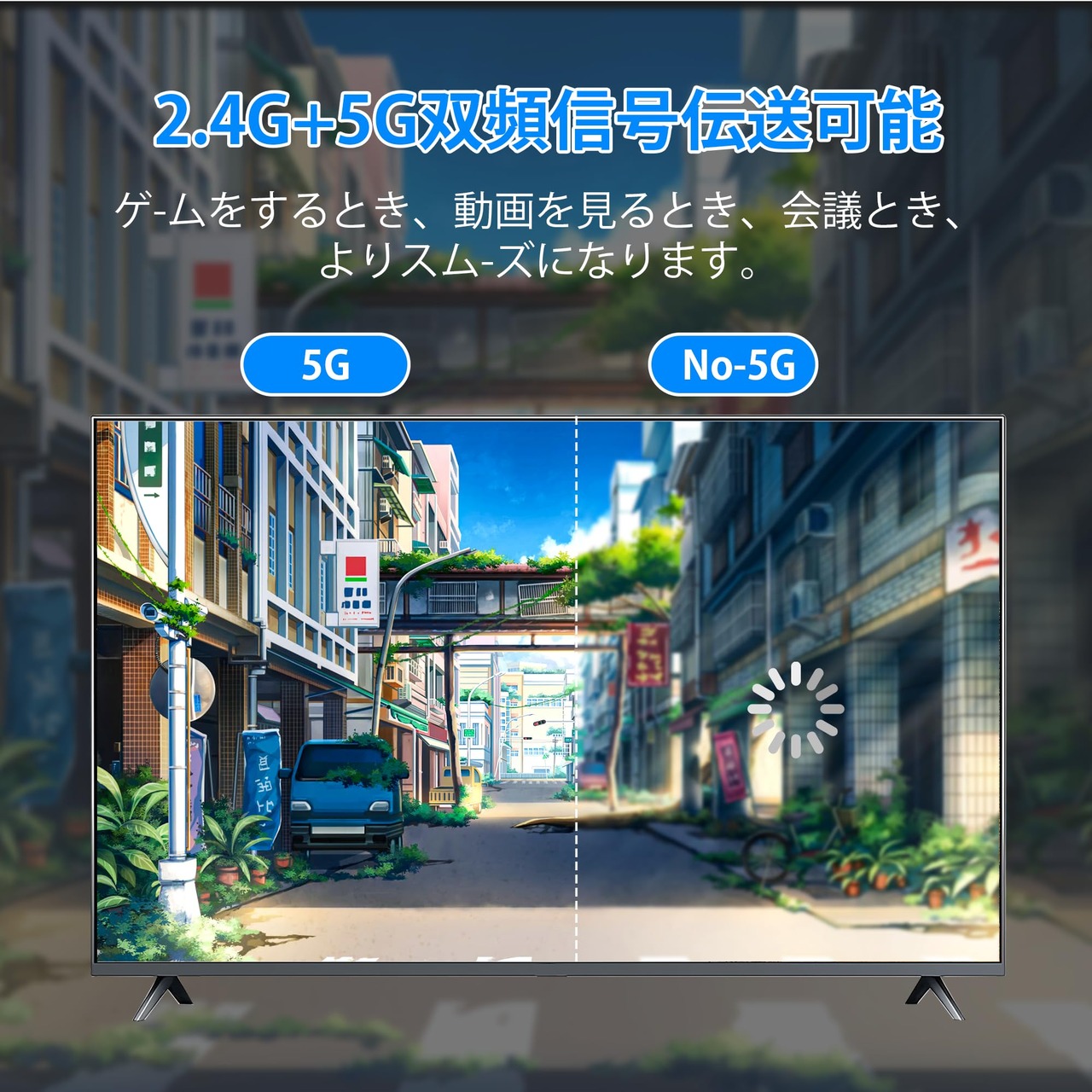 【1080P高解像度&30m無線伝送】ワイヤレス HDMI 送受信機 セットは1080PフルHD解像度、2.4G/5Gの無線デュアルバンド信号を備えており、電波干渉に強いため、より高品質なHDMI映像信号と高品質な音声信号を伝送できます。最大で30メートルの伝送距離と0.06秒の超低遅延を実現しており、最大12Mbpsの伝送速度を提供します。この製品は非常に信頼性が高く、安定した性能を提供しており、高解像度で鮮明な映像と音声、安定した信号、鮮やかな色、ノイズのない快適な視聴体験を楽しめます。(ご注意ください:HDMI無線化が壁を通過したり障害物に当たると、伝送距離や速度に影響が出る可能性があります。)