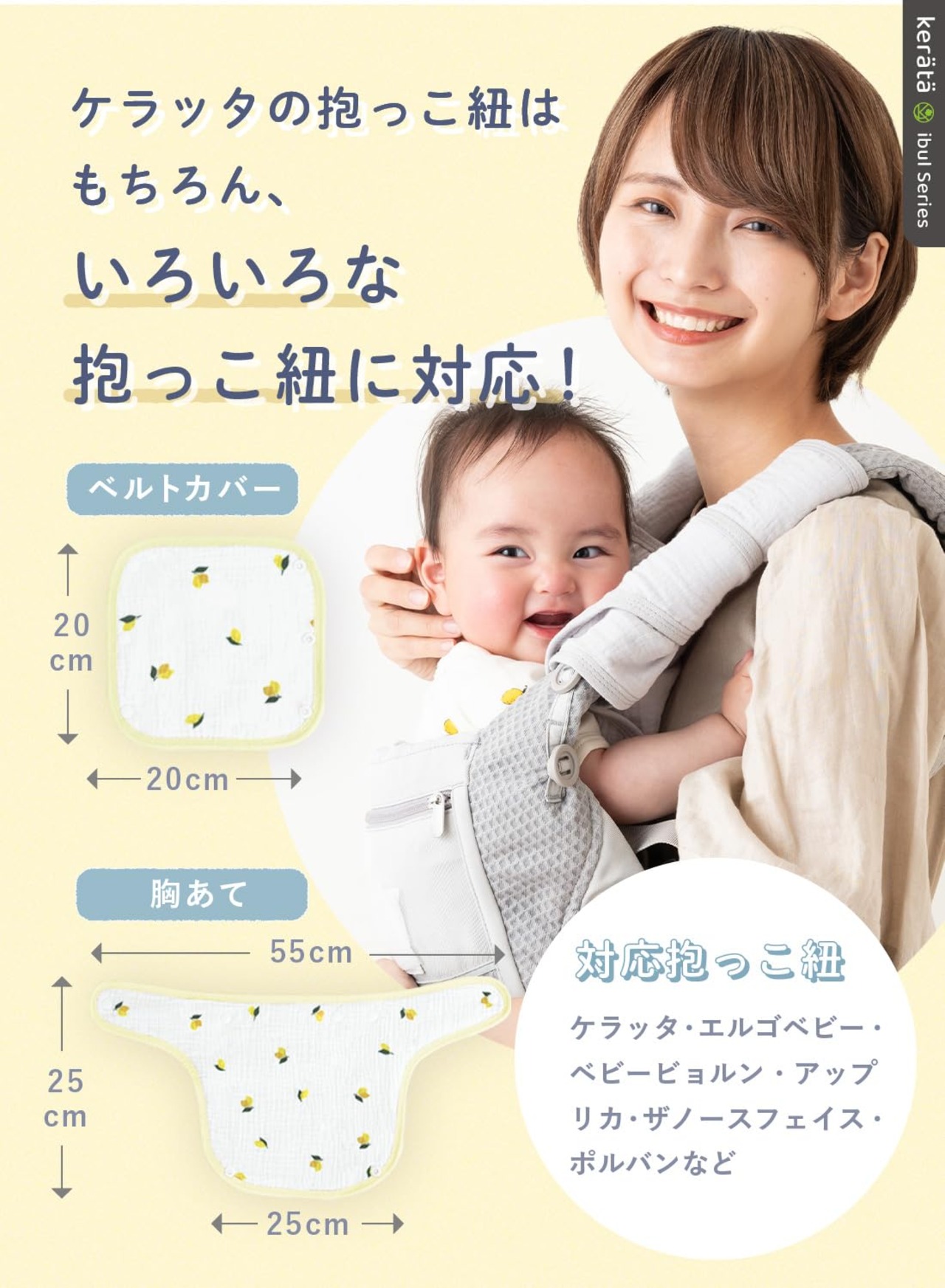 【どんな抱っこ紐も使える汎用サイズ】さまざまなメーカーの抱っこ紐にお使いいただけるように余裕を持ったサイズに設計しました。スナップボタンで簡単に着け外し可能です