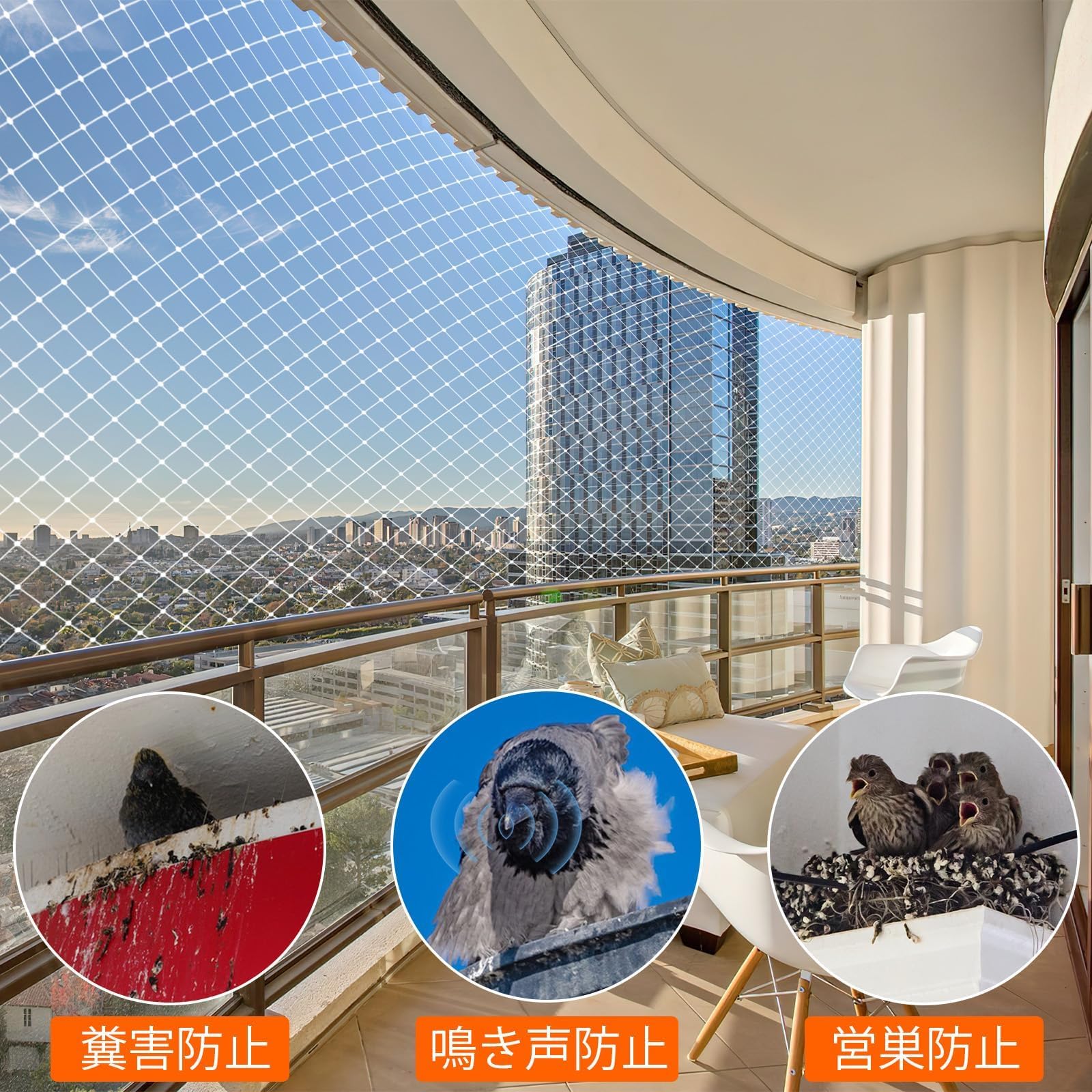 鳥害対策:ベランダの開口部分を鳥避けネットで覆えば、鳩は手すりにとまることもベランダに侵入することを防ぎ、鳩の糞害による病気などの健康被害、金属の腐食、害虫の発生など、鳥害を直接的に防ぐことができます。 カラスよけ、鳩よけ、スズメよけに大きく効果がある防鳥網です
