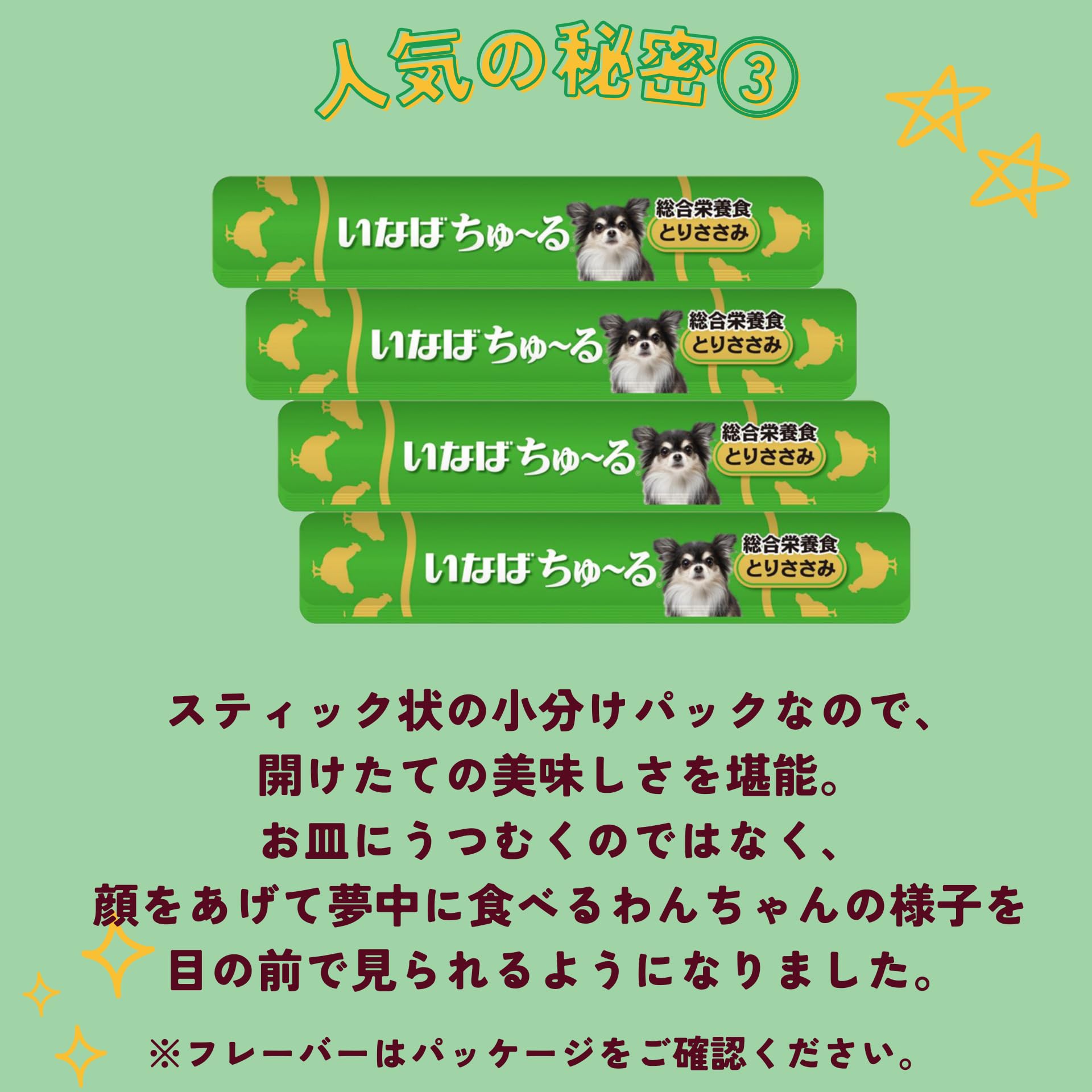 食べきりサイズの液状ごはんです。わんちゃんに必要な栄養素をバランス良く配合した総合栄養食のため、主食としてお与えいただけます。関節、骨、お腹、皮膚の健康に配慮した素材を配合し、わんちゃんの健康に配慮しました。4種類の味が楽しめるバラエティパックで、多頭飼いでもたっぷり使えます。外袋は環境に配慮した紙包材を使用。