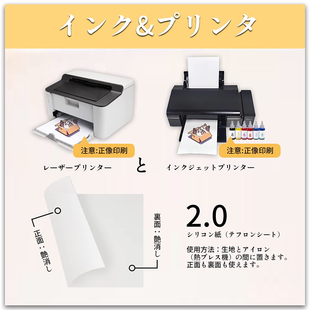 特性:インクジェット・レーザープリンター共用、正像印刷、転写簡単、洗濯に強い、優れる耐久性、鮮やかな色 高温耐性:特殊な日焼け止めコーティングを開発しました。紫外線強度15にも色褪せや黄色になりません。 抜群の接着性:シワなし!洗濯に強い!33回以上洗濯しても鮮やかな色を持ち続けます。 高通気性:シートの厚さ(台紙除く)は僅か0.12㎜です。仕上がりは柔らかな肌触です。