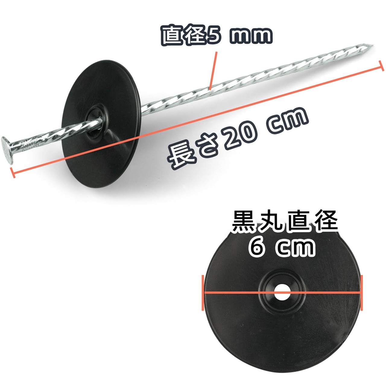 製品サイズ:螺旋釘杭:長さ20センチ、直径0.5センチ、黒丸直径6センチ。