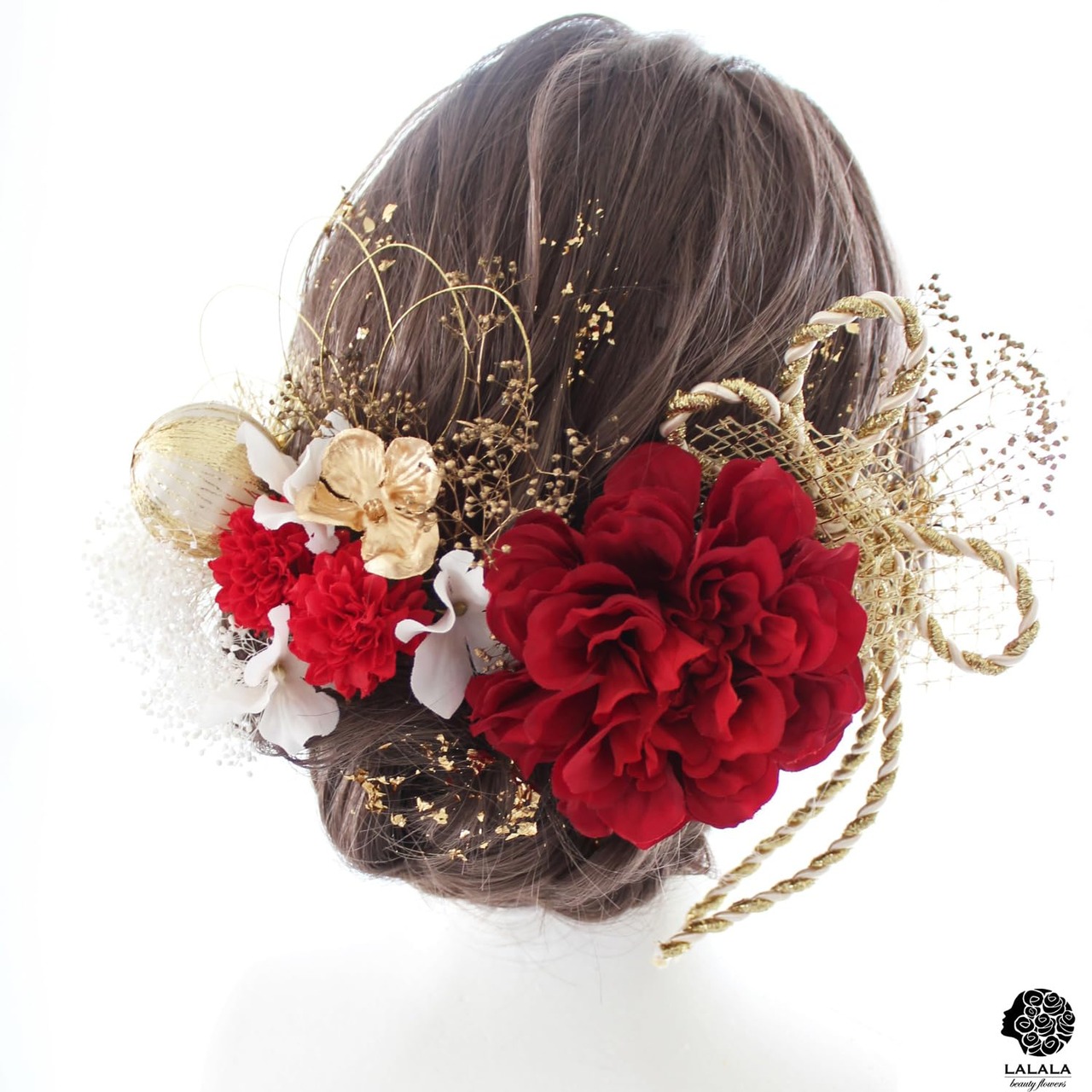 [LALALA] 卒業式 成人式 髪飾り ダリア アジサイ ミニマム かすみ草ゴールド ホワイト 和玉 金箔シート 縄リボン ゴールドネット 水引 和装 七五三 結婚式 入学式 花火大会 浴衣 着物 袴 振袖 [2090_2100]