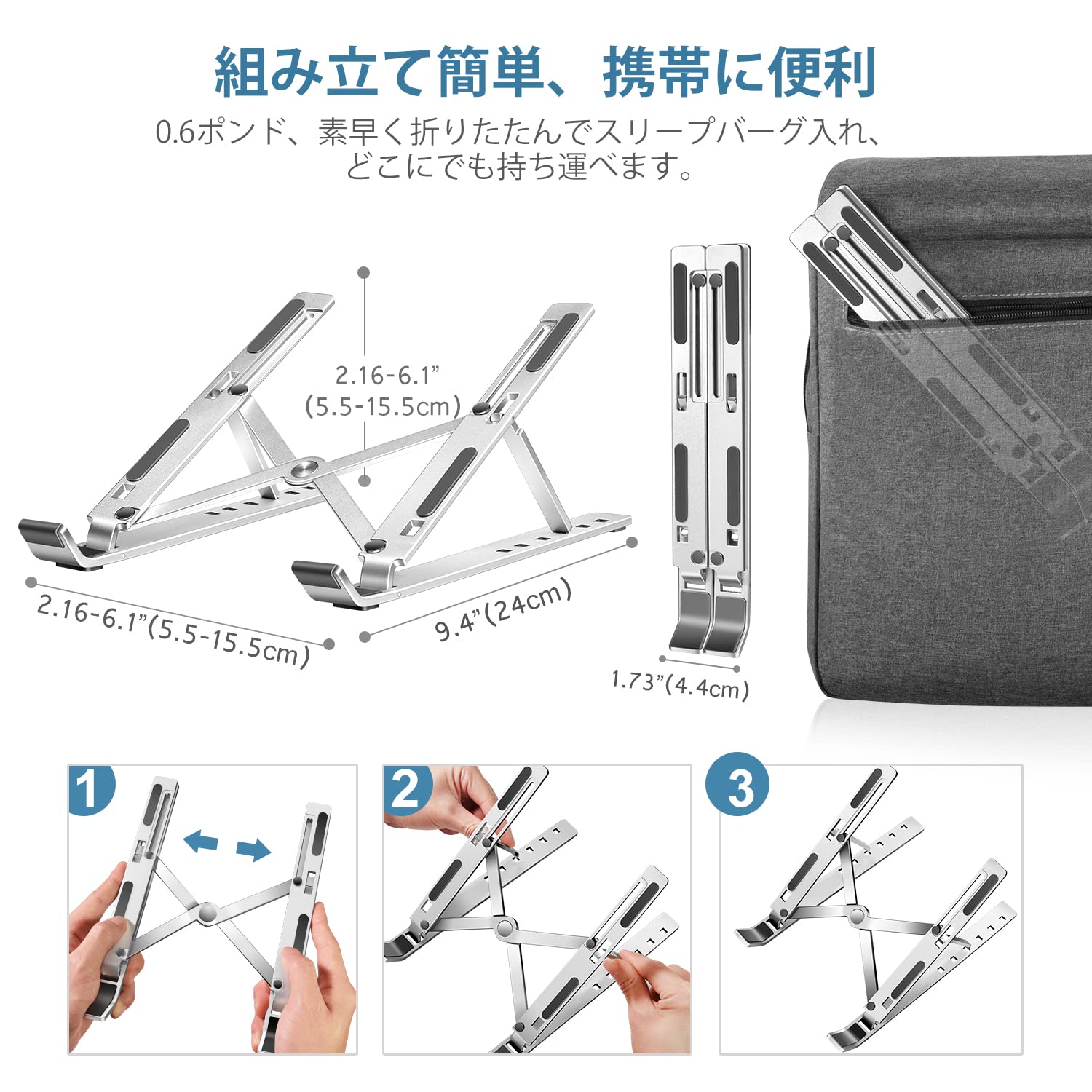 【持ち運び便利&滑り止め保護ゴム付】折りたたみ式ノートパソコンスタンドなので、簡単に折畳ってカバンの中に収納して持ち運べてでかけて、カフェや新幹線、飛行機移動中、出張、展示会など様々シーンに活躍できます。PCスタンド下にキーボードなどを収納できて、デスクスペースを有効に活用します。使わない時に折畳って隣に置いて邪魔しないです。パソコンが当たる部分にはシリコンゴム製の滑り止めが施されているので落下の心配なく使用が可能。設置面に長くて広い二個、フック内側に二個、足外側に二個、底部には四個、総計十個滑り止め用のシリコン製パッドがあり、全面的に大切なパソコンを守ります。スタンド接地側も滑り止めが付いているので、デスクに置くと滑りにくく安定して使えます。注意:スタンドが斜めになる台面と水とかある台面に置かないでください。