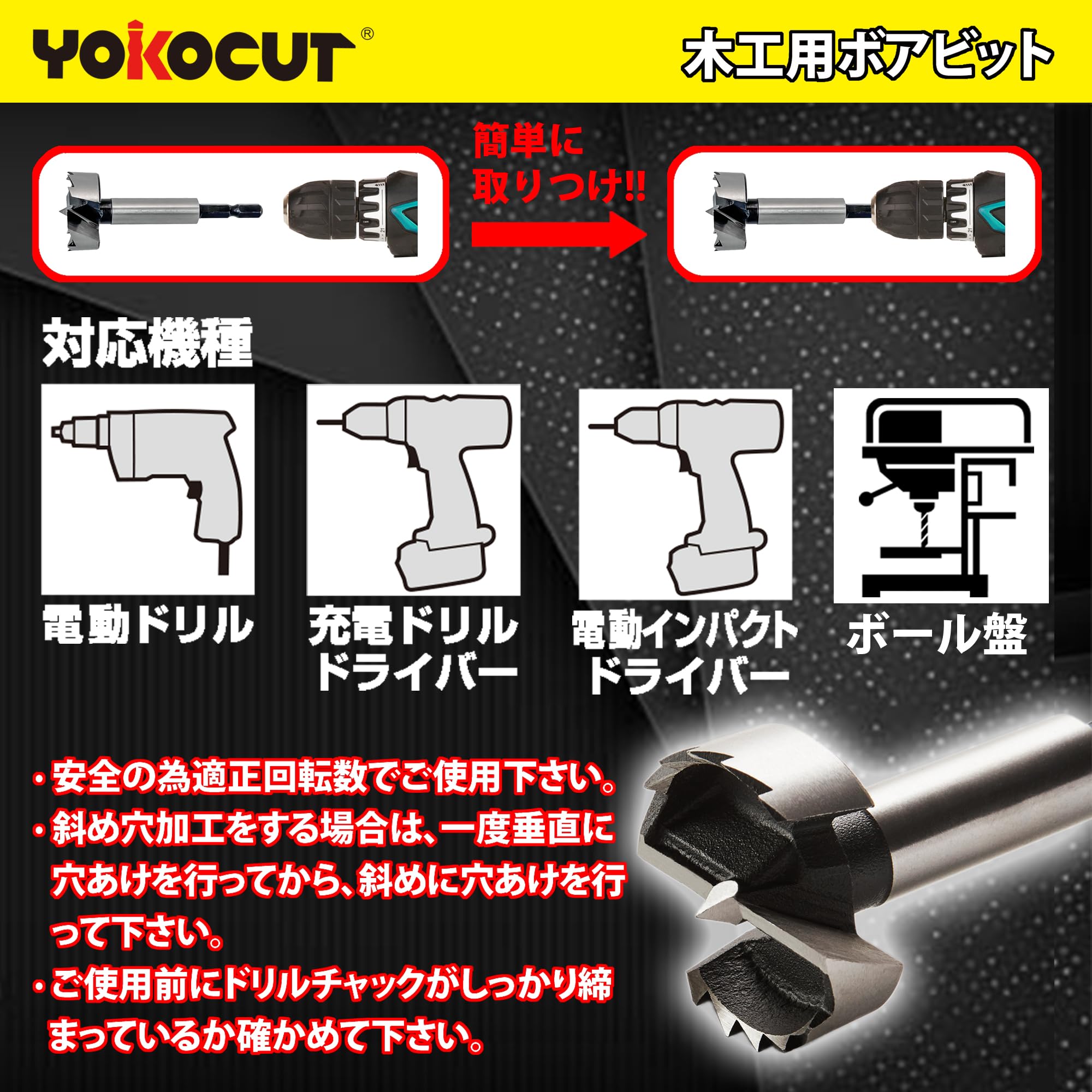 YOKOCUT 木工用ドリル 35mm 座グリビット ボアビット ドリルビット 六角軸 【日式6.35mm六角柄で電動ドリルに対応】電気ドリル・充電ドリルドライバー・充電インパクトドライバーに適合する日式6.35mm六角柄を採用しています。取り付けやすく、安定した回転を実現します。 【超硬チップで正確に穴あけ】真ん中の超硬チップが物体に固定され、丸い縁のガイドに従って、任意の方向に丸い穴を開けます。効率的なパンチングを行い、作業時間を短縮します。 【高炭素鋼材質で耐久性と切れ味を両立】高炭素鋼の素材を使用し、熱処理を施しています。製品の加工性能が良く、強度と靭性が高いです。刃を研磨した後も切れ味が鋭く、品質が安定しています。 【製品仕様】35mmシングル木工ドリル 【鋭い歯とコバルトめっきで高品質な穴あけ】歯のデザインにより摩擦と熱が効果的に低減され、きれいで滑らかでバリのない穴が得られます。表面にコバルトをめっきすることで、ドリルの熱放散性を高め、使用寿命を延ばします。 【防錆油と環境に優しい包装】ドリルは専門的な処理を受けており、乾性防錆油を塗布しています。 木工用ドリル 35mm 座グリビット 座ぐりドリル フォスナービット ドリルビット 木工 竹用ドリル 穴開けドリル ドリルビット セット ボアビット ドリルビット 六角軸 インパクトドライバー ドリルビット