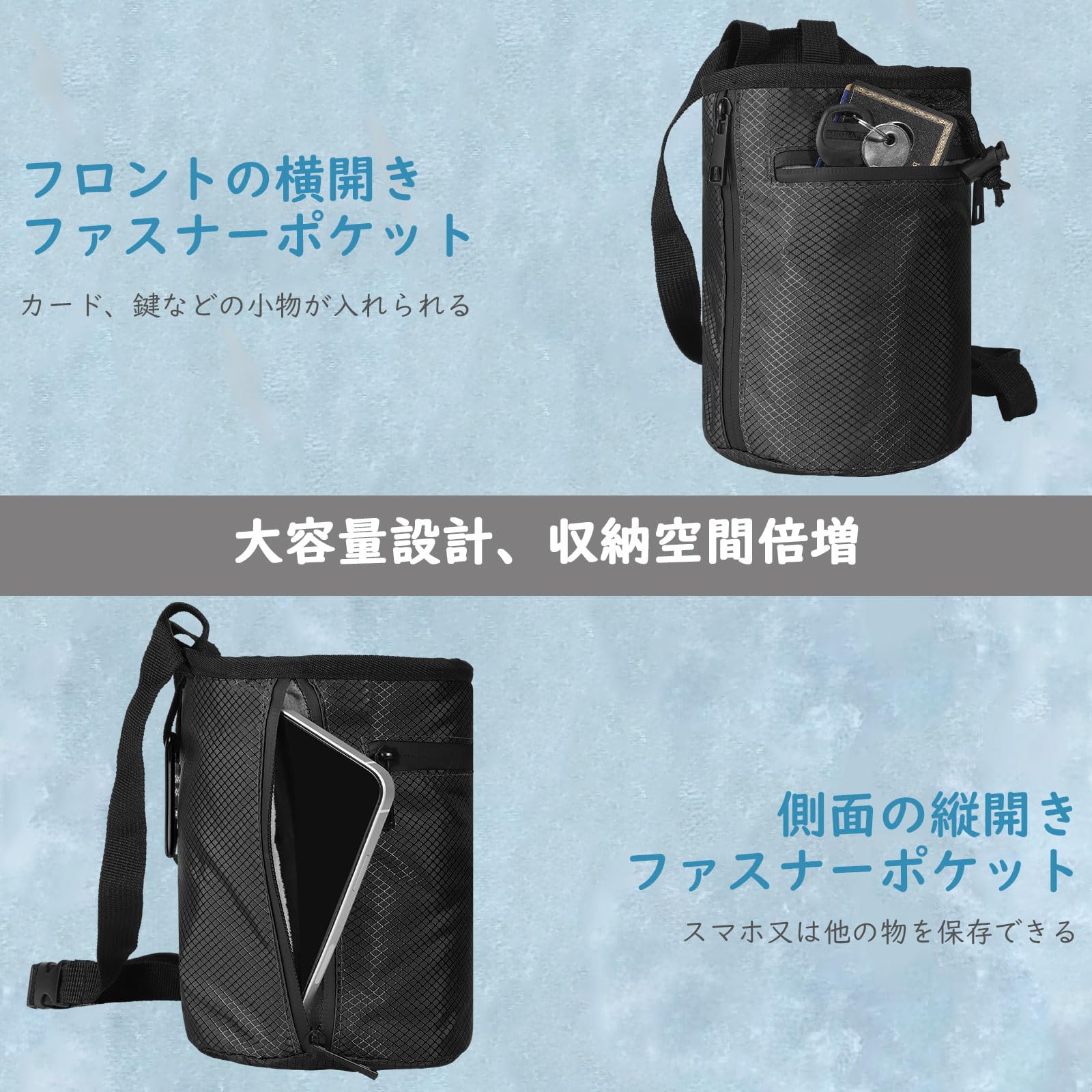 MoKo チョークバッグ ウエストポーチ巾着式 筒状 腰付けタイプ 広い開口部 斜め口式 表地ナイロン 裏地フリース ファスナーポケット配置 カラビナ付き 小物入れ ボルダリング クライミング アウトドア